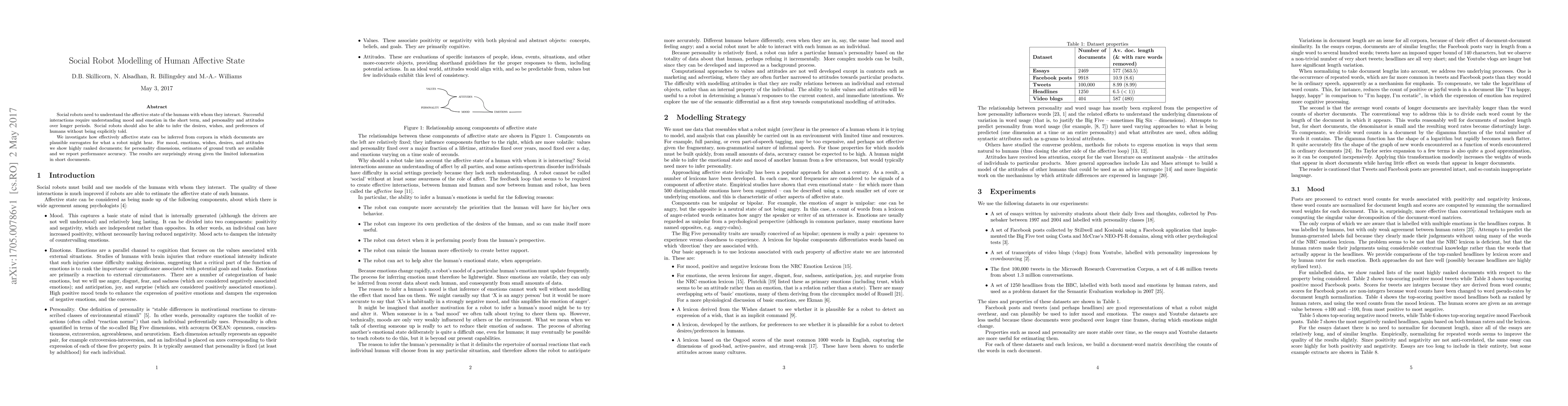 Social robots need to understand the affective state of the humans with whom they interact. Successful interactions require understanding mood and emotion in the short term, and personality and attitudes over longer periods. Social robots should also be able to infer the desires, wishes, and preferences of humans without being explicitly told. We investigate how effectively affective state can be inferred from corpora in which documents are plausible surrogates for what a robot might hear. For mood, emotions, wishes, desires, and attitudes we show highly ranked documents; for personality dimensions, estimates of ground truth are available and we report performance accuracy. The results are surprisingly strong given the limited information in short documents.