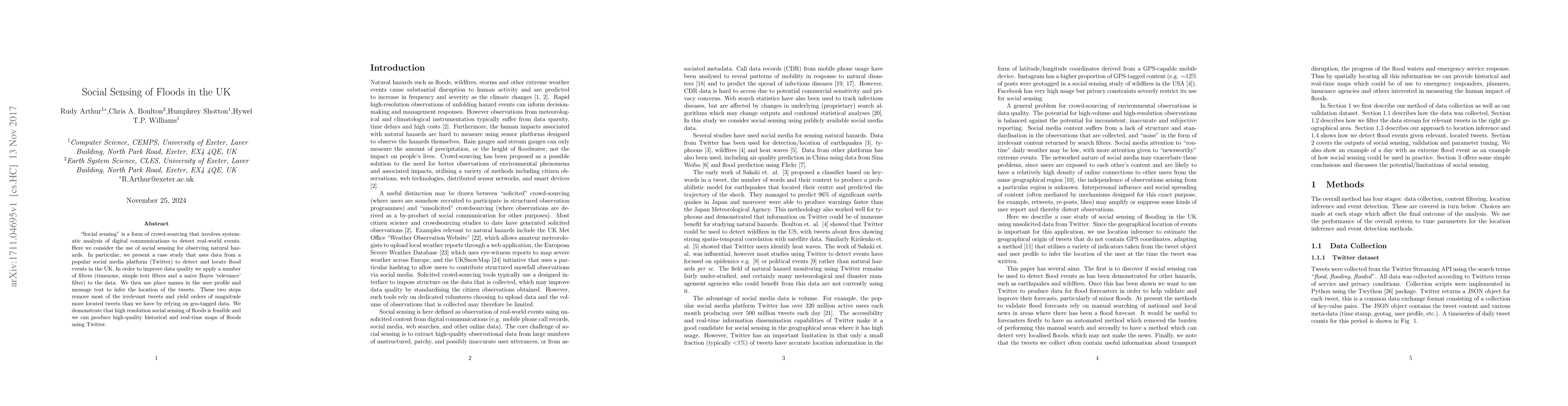 This paper explores the use of "social sensing" via Twitter to detect and locate flood events in the UK, employing filters to improve data quality and infer tweet locations. The study demonstrates high-resolution flood mapping feasibility and produces accurate historical and real-time flood maps.