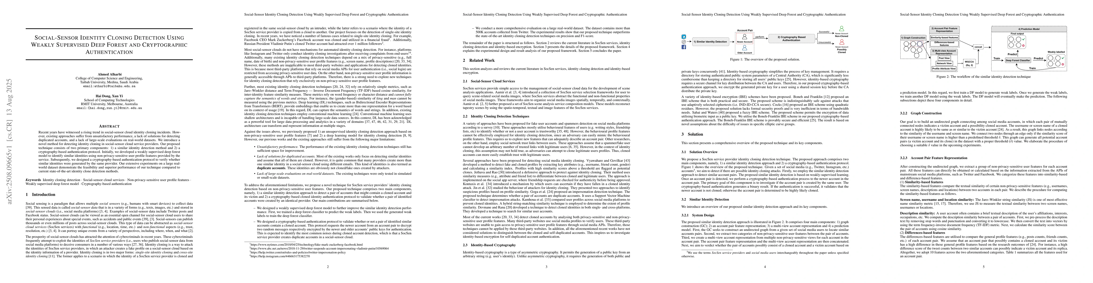 Recent years have witnessed a rising trend in social-sensor cloud identity cloning incidents. However, existing approaches suffer from unsatisfactory performance, a lack of solutions for detecting duplicated accounts, and a lack of large-scale evaluations on real-world datasets. We introduce a novel method for detecting identity cloning in social-sensor cloud service providers. Our proposed technique consists of two primary components: 1) a similar identity detection method and 2) a cryptography-based authentication protocol. Initially, we developed a weakly supervised deep forest model to identify similar identities using non-privacy-sensitive user profile features provided by the service. Subsequently, we designed a cryptography-based authentication protocol to verify whether similar identities were generated by the same provider. Our extensive experiments on a large real-world dataset demonstrate the feasibility and superior performance of our technique compared to current state-of-the-art identity clone detection methods.