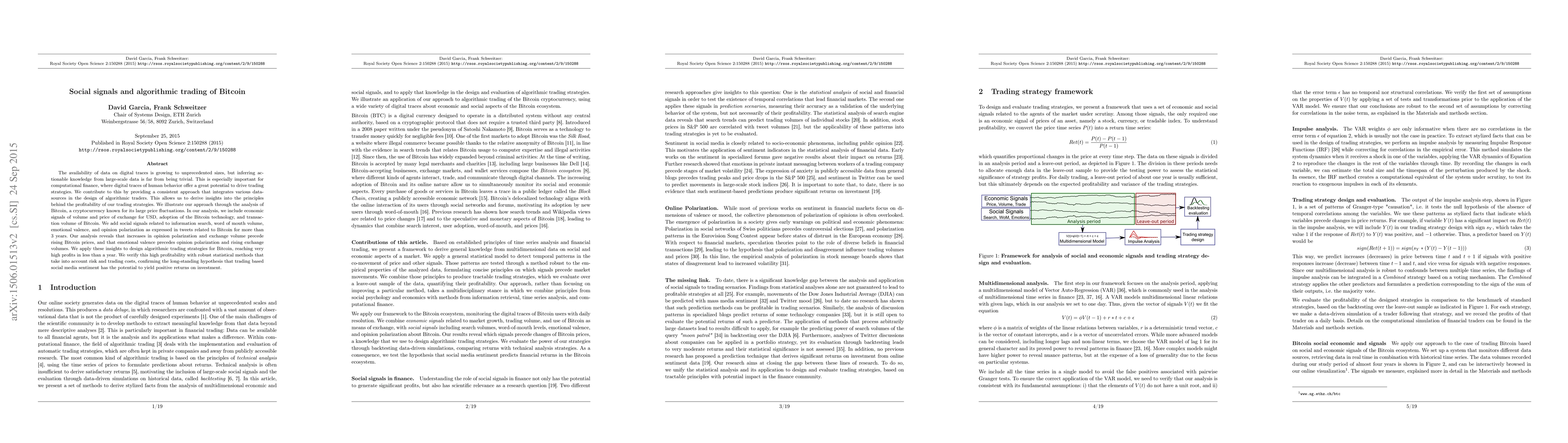 This paper explores the use of social signals and economic data to develop algorithmic trading strategies for Bitcoin. It finds that increased opinion polarization and exchange volume precede rising Bitcoin prices, leading to highly profitable algorithmic trading strategies.