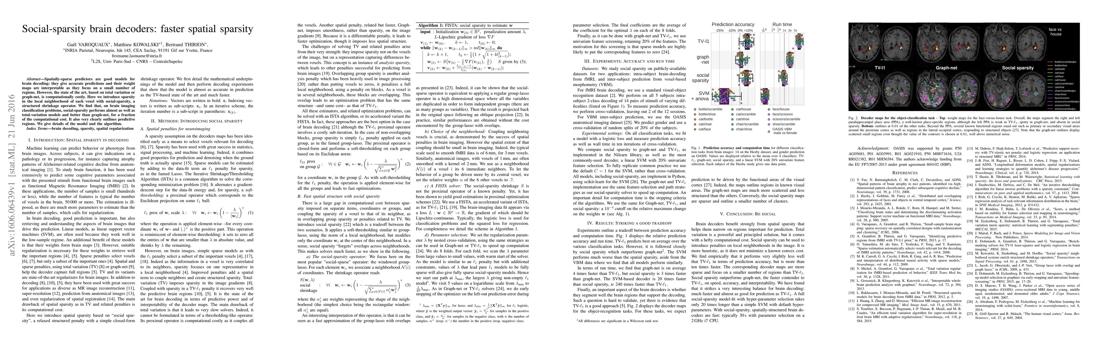 Spatially-sparse predictors are good models for brain decoding: they give accurate predictions and their weight maps are interpretable as they focus on a small number of regions. However, the state of the art, based on total variation or graph-net, is computationally costly. Here we introduce sparsity in the local neighborhood of each voxel with social-sparsity, a structured shrinkage operator. We find that, on brain imaging classification problems, social-sparsity performs almost as well as total-variation models and better than graph-net, for a fraction of the computational cost. It also very clearly outlines predictive regions. We give details of the model and the algorithm.
