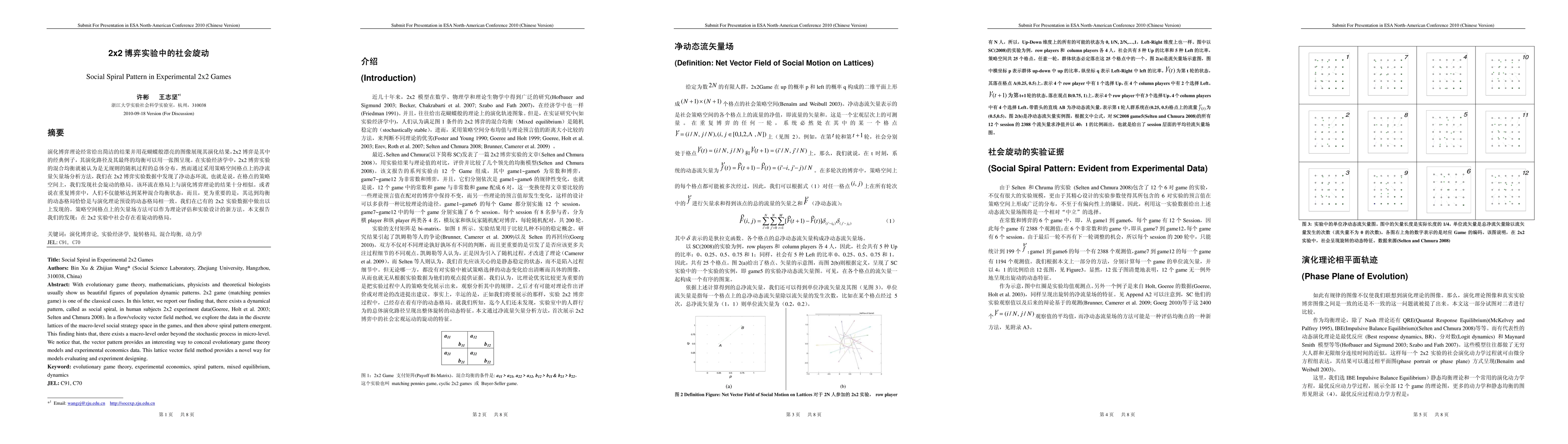 Researchers found a social spiral pattern in human subjects' 2x2 game data using a flow/velocity vector field method, suggesting macro-level order beyond stochastic processes at the micro-level. This discovery provides a novel way to model and design experiments in evolutionary game theory and economics.