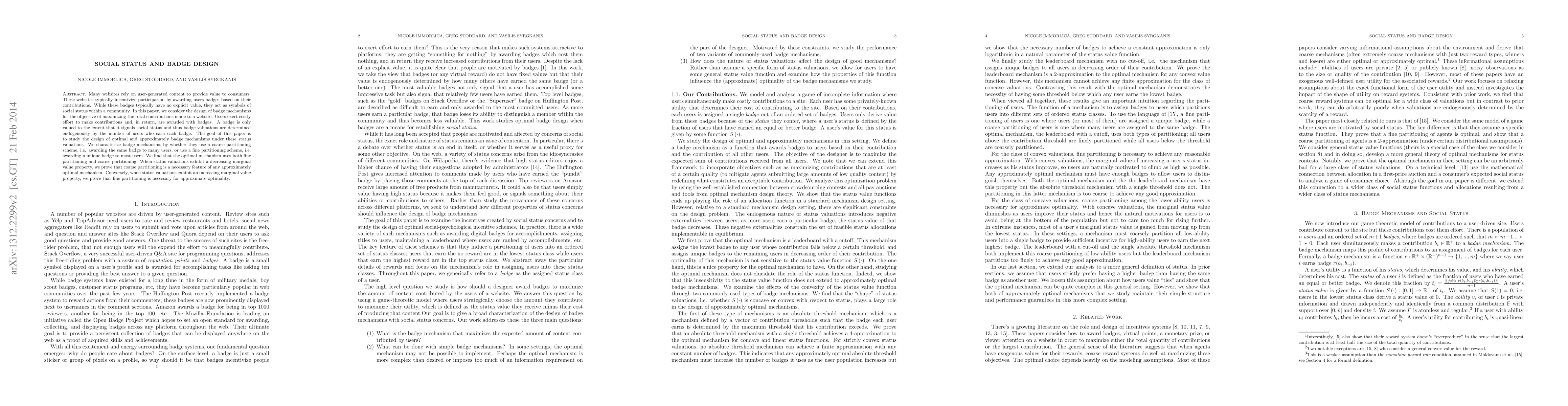 This paper investigates the design of badge mechanisms to maximize user contributions on websites, where badges symbolize social status. It finds that optimal badge mechanisms combine both fine and coarse partitioning schemes, with coarse partitioning being necessary when status valuations decrease with more users, and fine partitioning when valuations increase.