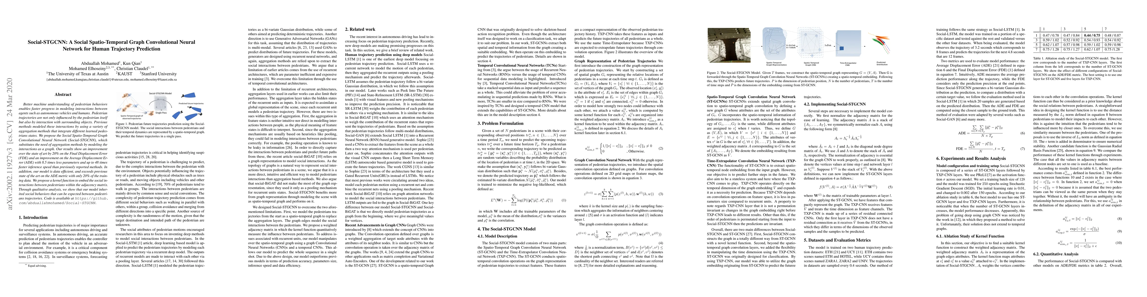 The Social Spatio-Temporal Graph Convolutional Neural Network (Social-STGCNN) enhances human trajectory prediction by modeling pedestrian interactions as a graph, achieving a 20% improvement in Final Displacement Error (FDE) and reducing parameters by 8.5 times while speeding up inference. The model is also data efficient, outperforming previous methods with only 20% of the training data.