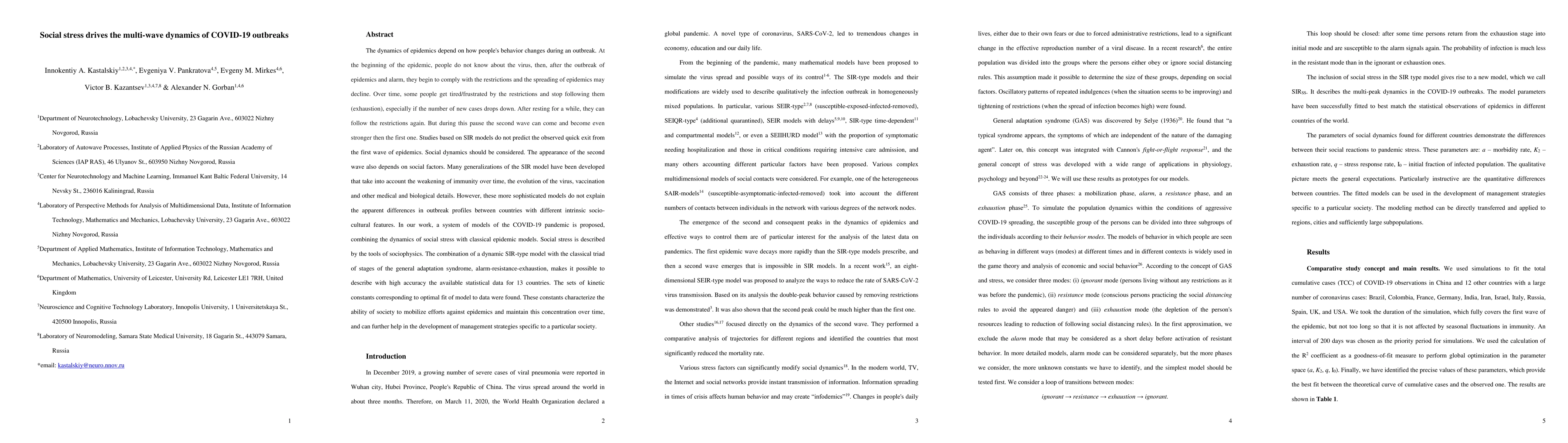 The dynamics of epidemics depend on how people's behavior changes during an outbreak. At the beginning of the epidemic, people do not know about the virus, then, after the outbreak of epidemics and alarm, they begin to comply with the restrictions and the spreading of epidemics may decline. Over time, some people get tired/frustrated by the restrictions and stop following them (exhaustion), especially if the number of new cases drops down. After resting for a while, they can follow the restrictions again. But during this pause the second wave can come and become even stronger then the first one. Studies based on SIR models do not predict the observed quick exit from the first wave of epidemics. Social dynamics should be considered. The appearance of the second wave also depends on social factors. Many generalizations of the SIR model have been developed that take into account the weakening of immunity over time, the evolution of the virus, vaccination and other medical and biological details. However, these more sophisticated models do not explain the apparent differences in outbreak profiles between countries with different intrinsic socio-cultural features. In our work, a system of models of the COVID-19 pandemic is proposed, combining the dynamics of social stress with classical epidemic models. Social stress is described by the tools of sociophysics. The combination of a dynamic SIR-type model with the classical triad of stages of the general adaptation syndrome, alarm-resistance-exhaustion, makes it possible to describe with high accuracy the available statistical data for 13 countries. The sets of kinetic constants corresponding to optimal fit of model to data were found. They characterize the ability of society to mobilize efforts against epidemics and maintain this concentration over time, and can further help in the development of strategies specific to a particular society.