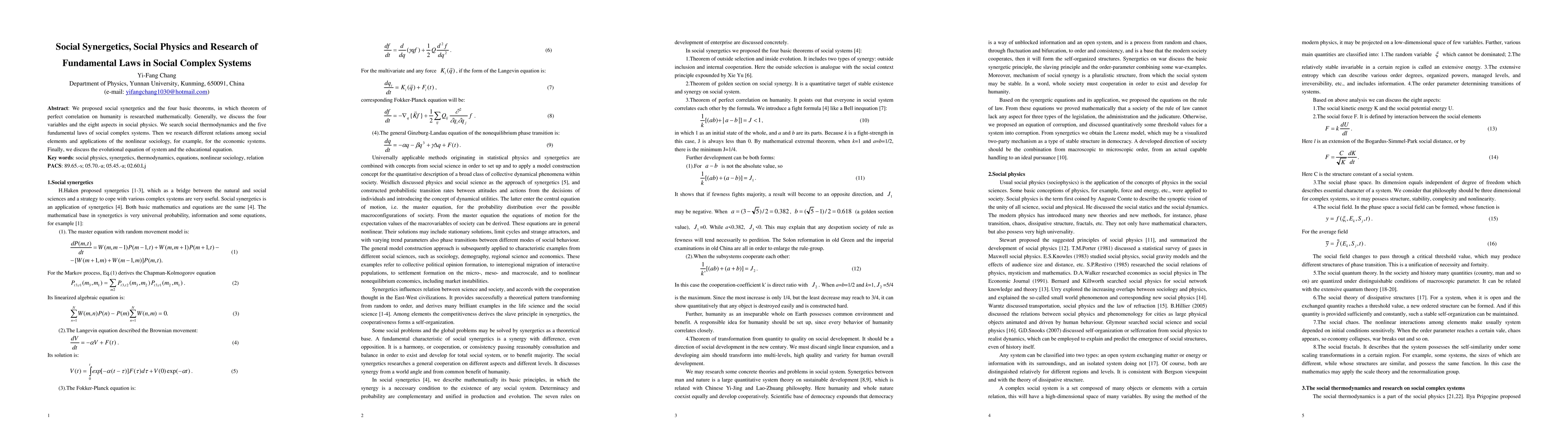 The paper introduces social synergetics and four basic theorems, focusing on the theorem of perfect correlation in human behavior. It explores social physics variables and aspects, and investigates social thermodynamics and five fundamental laws in social systems. The study also examines relations among social elements using nonlinear sociology, with applications in economic systems. Lastly, it discusses evolutionary and educational equations in social complex systems.
