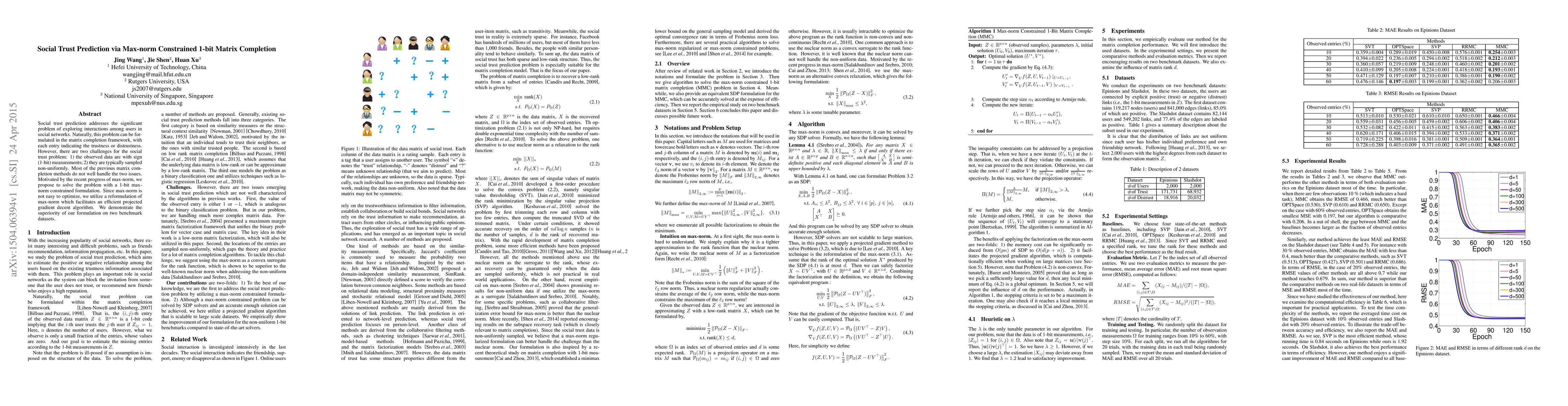 This paper proposes a max-norm constrained 1-bit matrix completion method to predict social trust in social networks, addressing the challenges of sign-based measurements and non-uniform sampling. An efficient projected gradient descent algorithm is developed to optimize the max-norm formulation, and the method's effectiveness is validated on two benchmark datasets.