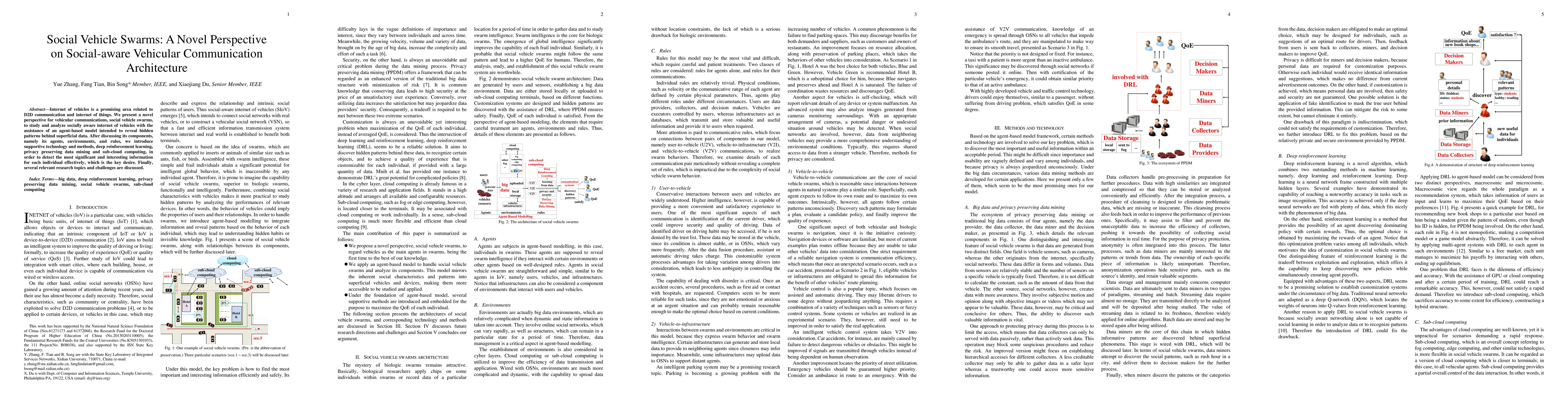 Internet of vehicles is a promising area related to D2D communication and internet of things. We present a novel perspective for vehicular communications, social vehicle swarms, to study and analyze socially aware internet of vehicles with the assistance of an agent-based model intended to reveal hidden patterns behind superficial data. After discussing its components, namely its agents, environments, and rules, we introduce supportive technology and methods, deep reinforcement learning, privacy preserving data mining and sub-cloud computing, in order to detect the most significant and interesting information for each individual effectively, which is the key desire. Finally, several relevant research topics and challenges are discussed.