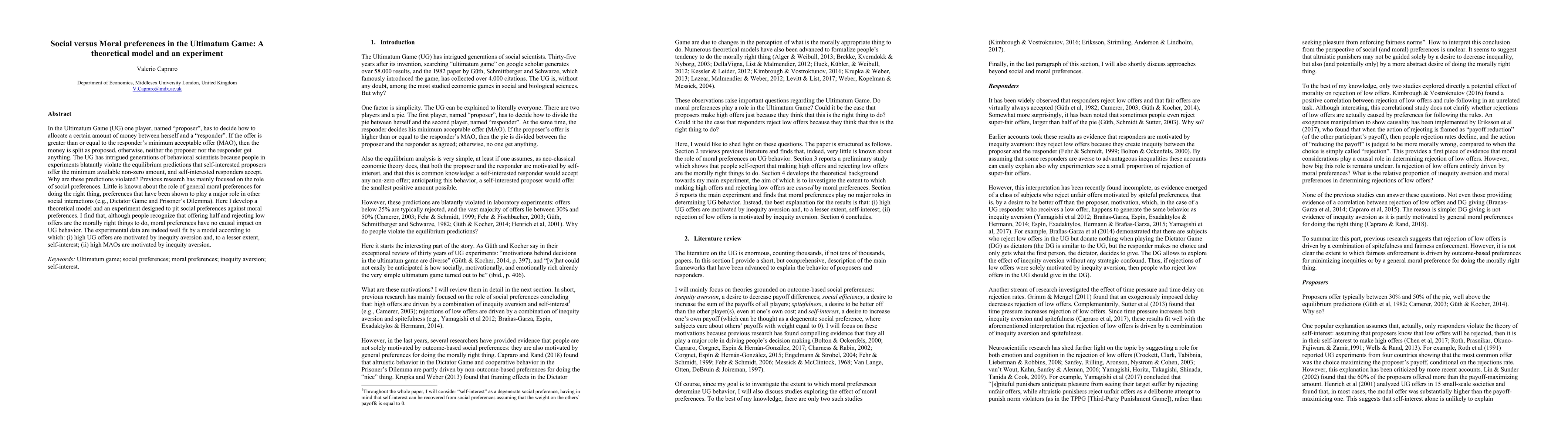 This paper develops a theoretical model and conducts an experiment to explore the Ultimatum Game (UG), comparing social versus moral preferences. The study finds that while moral preferences exist, they do not influence UG behavior, which is instead driven by inequity aversion and self-interest.