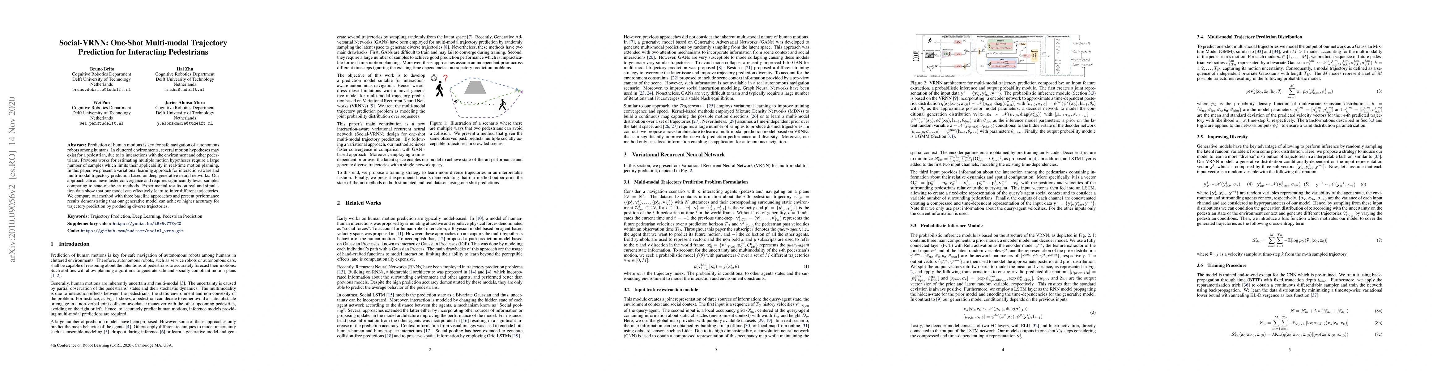 This paper introduces a variational learning approach called Social-VRNN for predicting multi-modal trajectories of interacting pedestrians using deep generative neural networks. The method achieves faster convergence and requires fewer samples compared to existing techniques, demonstrating higher accuracy and the ability to infer diverse trajectories in both real and simulated environments.