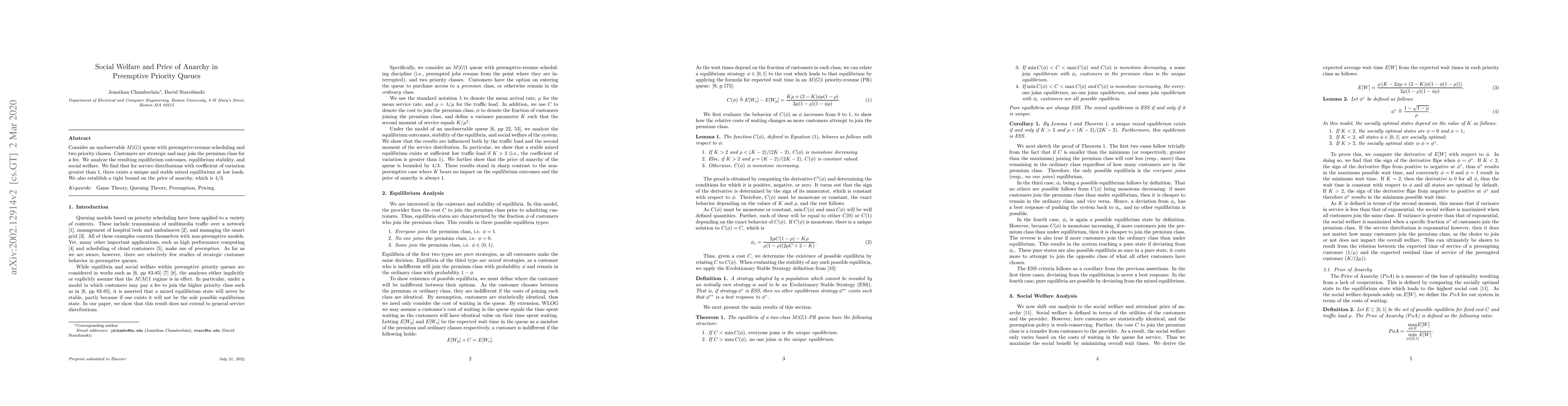 This paper examines a preemptive priority queue with two classes where customers can opt for a premium class for a fee. It finds a unique stable mixed equilibrium at low loads and establishes a price of anarchy bound of $4/3$ for service distributions with a coefficient of variation greater than 1.