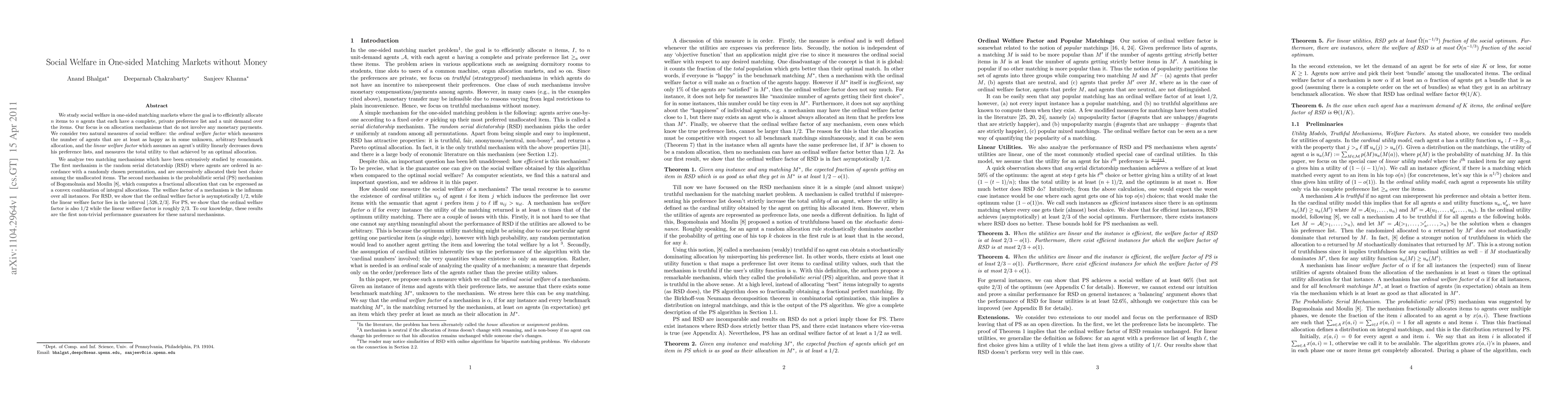 This paper examines social welfare in one-sided matching markets without monetary transactions, focusing on two allocation mechanisms: random serial dictatorship (RSD) and probabilistic serial (PS). It finds that both RSD and PS achieve an ordinal welfare factor of 1/2, while RSD's linear welfare factor ranges between 0.526 and 2/3, and PS's linear welfare factor is approximately 2/3.