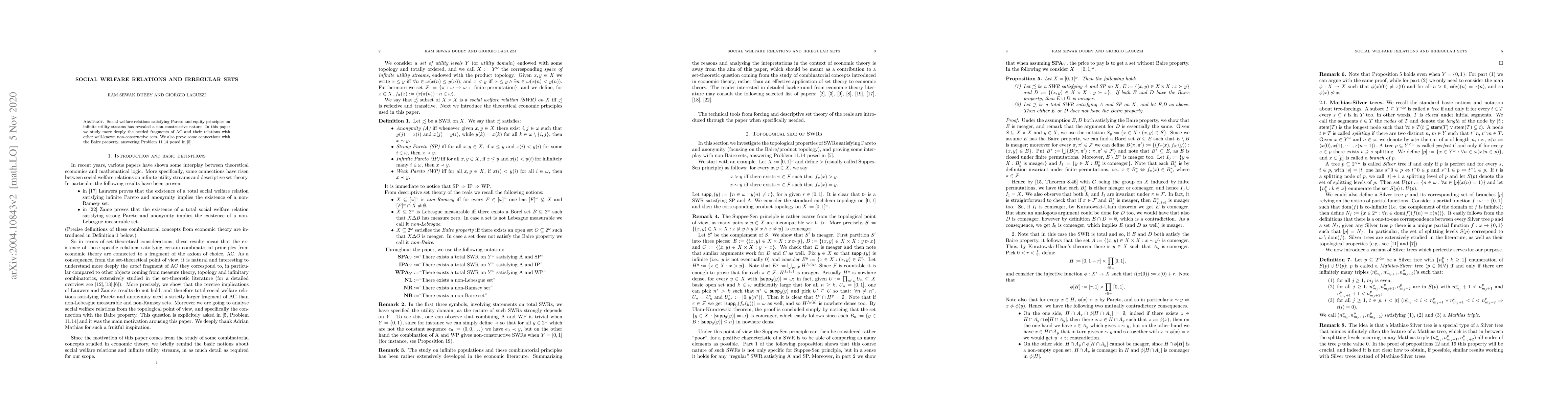 Research reveals that social welfare relations satisfying Pareto and equity principles require a larger fragment of AC than previously thought, connecting to the Baire property. This finding answers a problem posed in