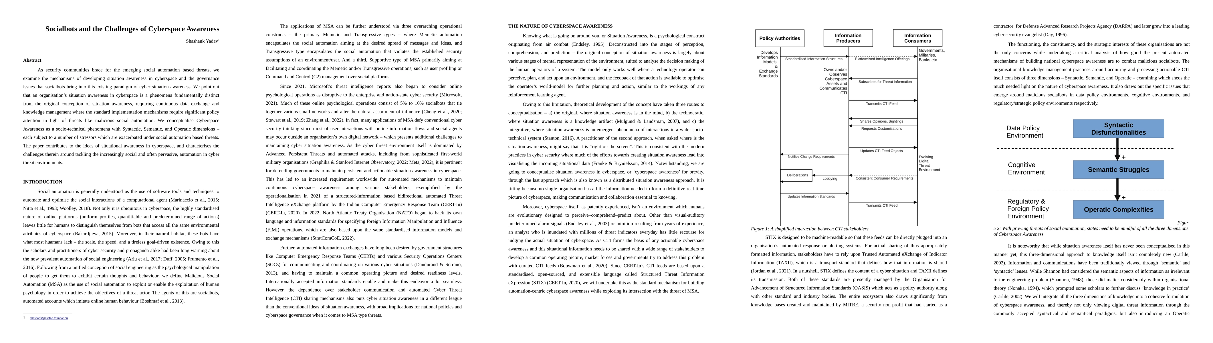 This paper explores the complexities of developing situation awareness in cyberspace amidst the rise of social automation threats, termed socialbots. It introduces Cyberspace Awareness as a socio-technical phenomenon with distinct syntactic, semantic, and operatic dimensions, highlighting the governance challenges and policy considerations necessary to address these threats.