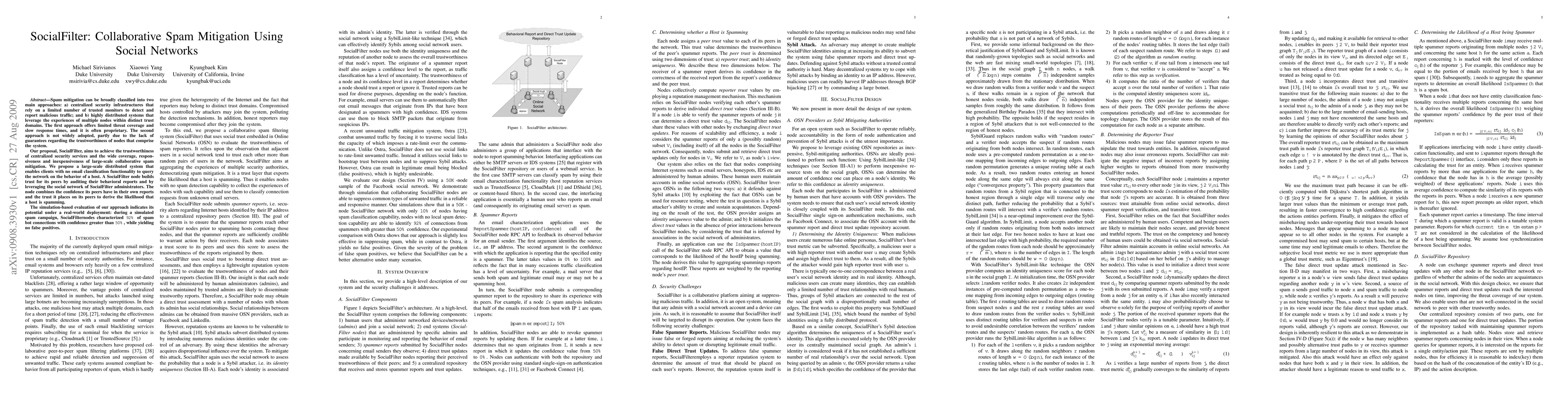 Spam mitigation can be broadly classified into two main approaches: a) centralized security infrastructures that rely on a limited number of trusted monitors to detect and report malicious traffic; and b) highly distributed systems that leverage the experiences of multiple nodes within distinct trust domains. The first approach offers limited threat coverage and slow response times, and it is often proprietary. The second approach is not widely adopted, partly due to the lack of guarantees regarding the trustworthiness of nodes that comprise the system. Our proposal, SocialFilter, aims to achieve the trustworthiness of centralized security services and the wide coverage, responsiveness and inexpensiveness of large-scale collaborative spam mitigation. We propose a large-scale distributed system that enables clients with no email classification functionality to query the network on the behavior of a host. A SocialFilter node builds trust for its peers by auditing their behavioral reports and by leveraging the social network of SocialFilter administrators. The node combines the confidence its peers have in their own reports and the trust it places on its peers to derive the likelihood that a host is spamming. The simulation-based evaluation of our approach indicates its potential under a real-world deployment: during a simulated spam campaign, SocialFilternodes characterized 92% of spam bot connections with confidence greater than 50%, while yielding no false positives
