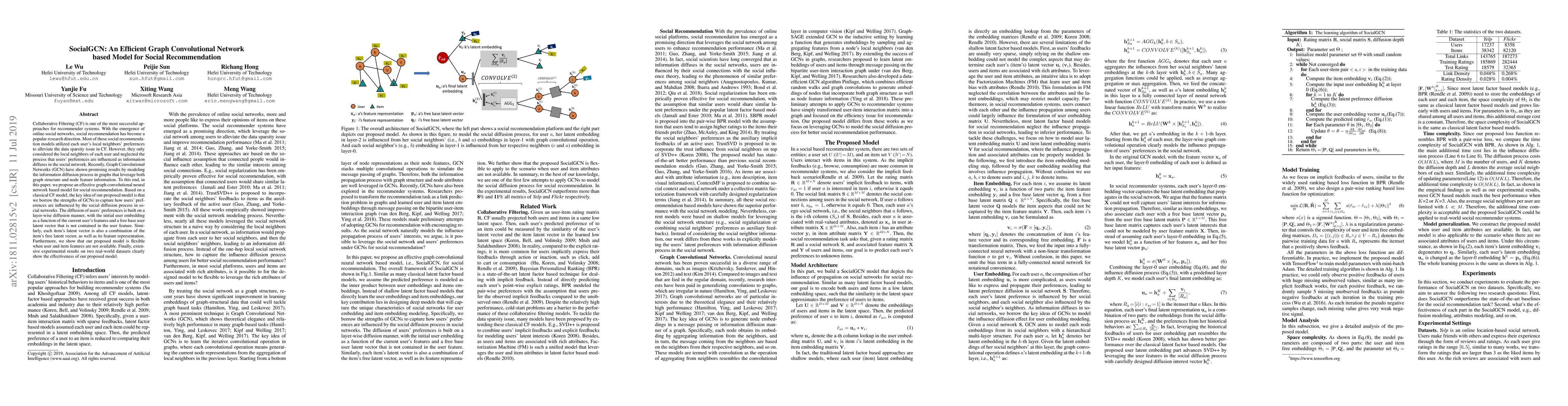 The paper proposes SocialGCN, a graph convolutional network model for social recommendation that leverages information diffusion in social networks. This model enhances collaborative filtering by capturing how users' preferences evolve through social connections, demonstrating improved performance over traditional methods on real-world datasets.