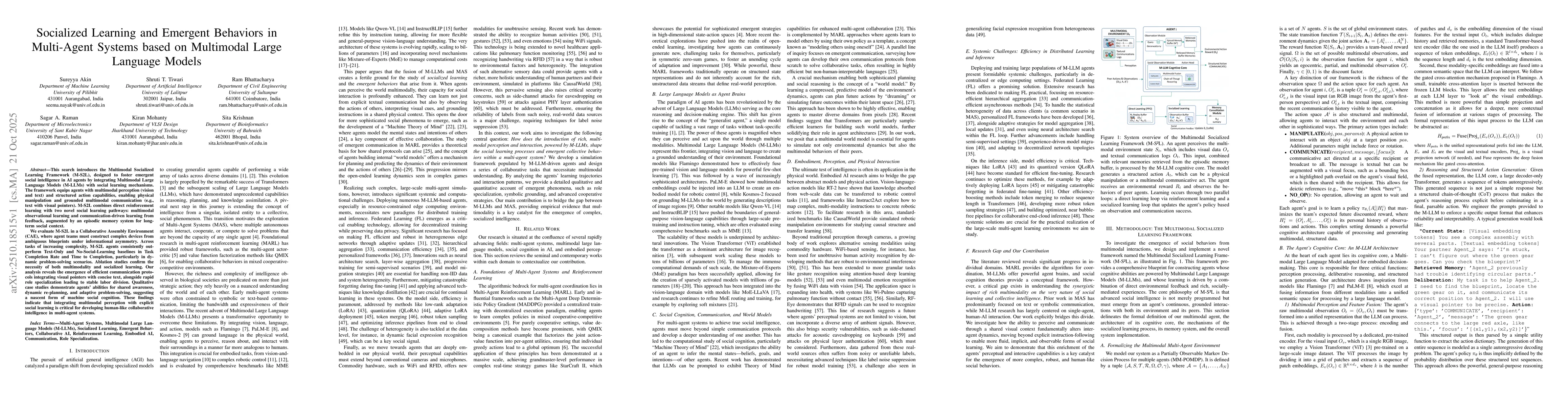 This search introduces the Multimodal Socialized Learning Framework (M-S2L), designed to foster emergent social intelligence in AI agents by integrating Multimodal Large Language Models (M-LLMs) with social learning mechanisms. The framework equips agents with multimodal perception (vision and text) and structured action capabilities, enabling physical manipulation and grounded multimodal communication (e.g., text with visual pointers). M-S2L combines direct reinforcement learning with two novel social learning pathways: multimodal observational learning and communication-driven learning from feedback, augmented by an episodic memory system for long-term social context. We evaluate M-S2L in a Collaborative Assembly Environment (CAE), where agent teams must construct complex devices from ambiguous blueprints under informational asymmetry. Across tasks of increasing complexity, M-S2L agents consistently outperform Text-Only and No-Social-Learning baselines in Task Completion Rate and Time to Completion, particularly in dynamic problem-solving scenarios. Ablation studies confirm the necessity of both multimodality and socialized learning. Our analysis reveals the emergence of efficient communication protocols integrating visual pointers with concise text, alongside rapid role specialization leading to stable labor division. Qualitative case studies demonstrate agents' abilities for shared awareness, dynamic re-planning, and adaptive problem-solving, suggesting a nascent form of machine social cognition. These findings indicate that integrating multimodal perception with explicit social learning is critical for developing human-like collaborative intelligence in multi-agent systems.
