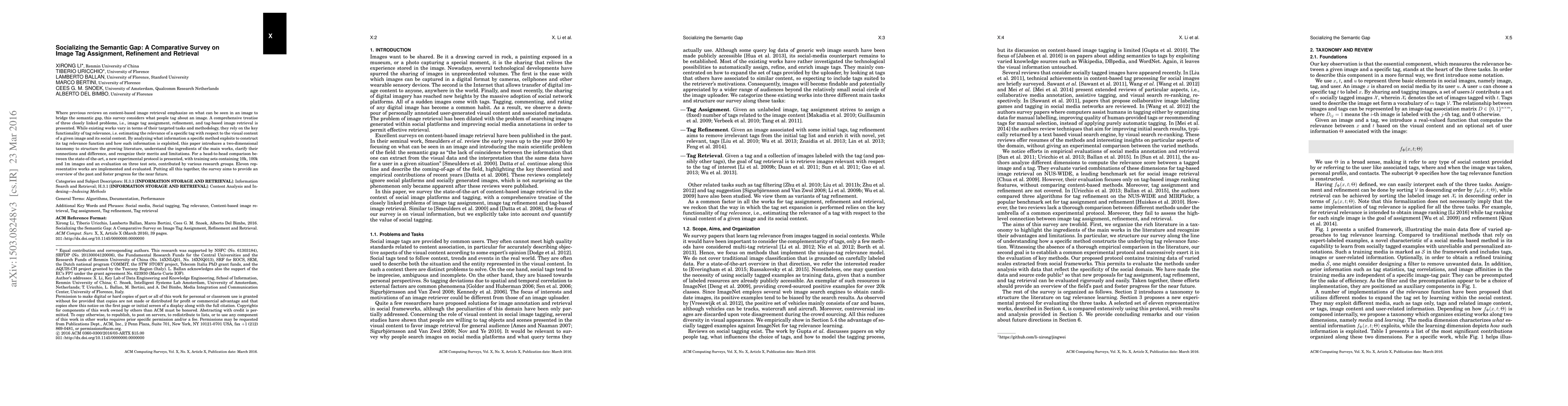 Where previous reviews on content-based image retrieval emphasize on what can be seen in an image to bridge the semantic gap, this survey considers what people tag about an image. A comprehensive treatise of three closely linked problems, i.e., image tag assignment, refinement, and tag-based image retrieval is presented. While existing works vary in terms of their targeted tasks and methodology, they rely on the key functionality of tag relevance, i.e. estimating the relevance of a specific tag with respect to the visual content of a given image and its social context. By analyzing what information a specific method exploits to construct its tag relevance function and how such information is exploited, this paper introduces a taxonomy to structure the growing literature, understand the ingredients of the main works, clarify their connections and difference, and recognize their merits and limitations. For a head-to-head comparison between the state-of-the-art, a new experimental protocol is presented, with training sets containing 10k, 100k and 1m images and an evaluation on three test sets, contributed by various research groups. Eleven representative works are implemented and evaluated. Putting all this together, the survey aims to provide an overview of the past and foster progress for the near future.