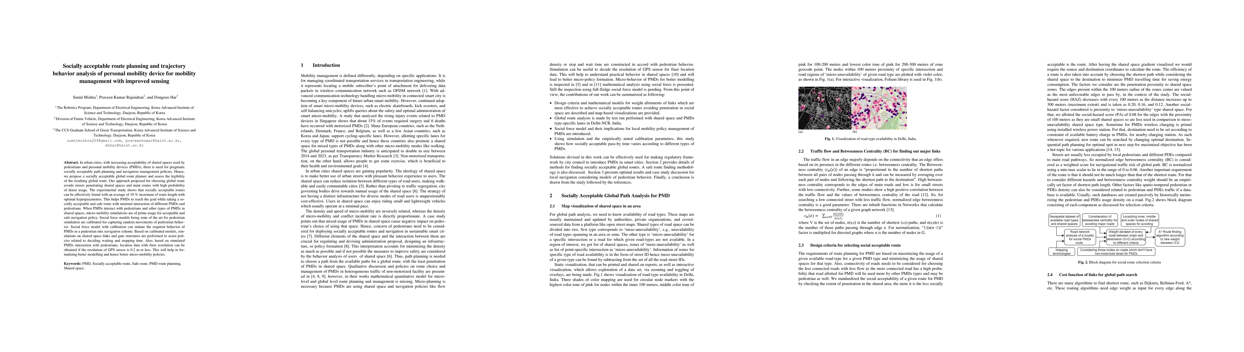 In urban cities, with increasing acceptability of shared spaces used by pedestrians and personal mobility devices (PMDs), there is need for pragmatic socially ac-ceptable path planning and navigation management policies. Hence, we propose a socially acceptable global route planner and assess the legibility of the resulting global route. Our approach proposed for choosing global route avoids streets penetrating shared spaces and main routes with high probability of dense usage. The experimental study shows that socially acceptable routes can be effectively found with an average of 10 % increment of route length with optimal hyperpa-rameters. This helps PMDs to reach the goal while taking a socially acceptable and safe route with minimal interaction of different PMDs and pedestrians. When PMDs interact with pedestrians and other types of PMDs in shared spaces, mi-cro-mobility simulations are of prime usage for acceptable and safe navigation policy. Social force models being state of the art for pedestrian simulation are cal-ibrated for capturing random movements of pedestrian behavior. Social force model with calibration can imitate the required behavior of PMDs in a pedestrian mix navigation scheme. Based on calibrated models, simulations on shared space links and gate structures are performed to assist policies related to deciding wait-ing and stopping time. Also, based on simulated PMDs interaction with pedestri-ans, location data with finer resolution can be obtained if the resolution of GPS sensor is 0.2 m or less. This will help in formalizing better modelling and hence better micro-mobility policies.