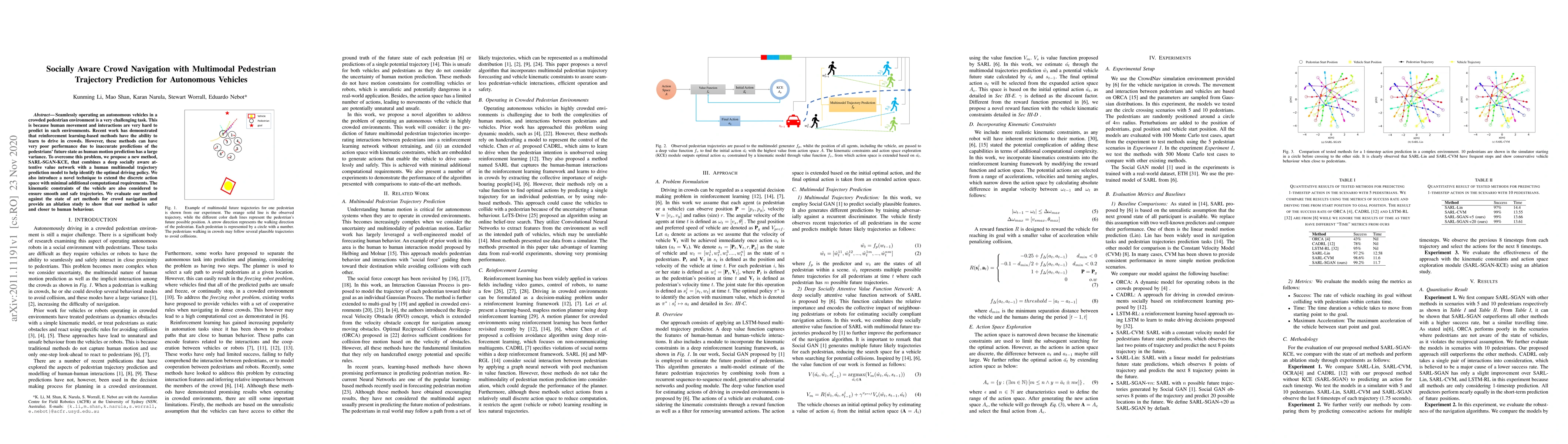 This paper proposes SARL-SGAN-KCE, a novel method combining reinforcement learning with a socially aware attentive value network and a multimodal trajectory prediction model to enhance autonomous vehicle navigation in crowded pedestrian environments. The method extends the discrete action space with minimal computational overhead and considers kinematic constraints for safe, smooth trajectories, outperforming existing methods in safety and human-like behavior.