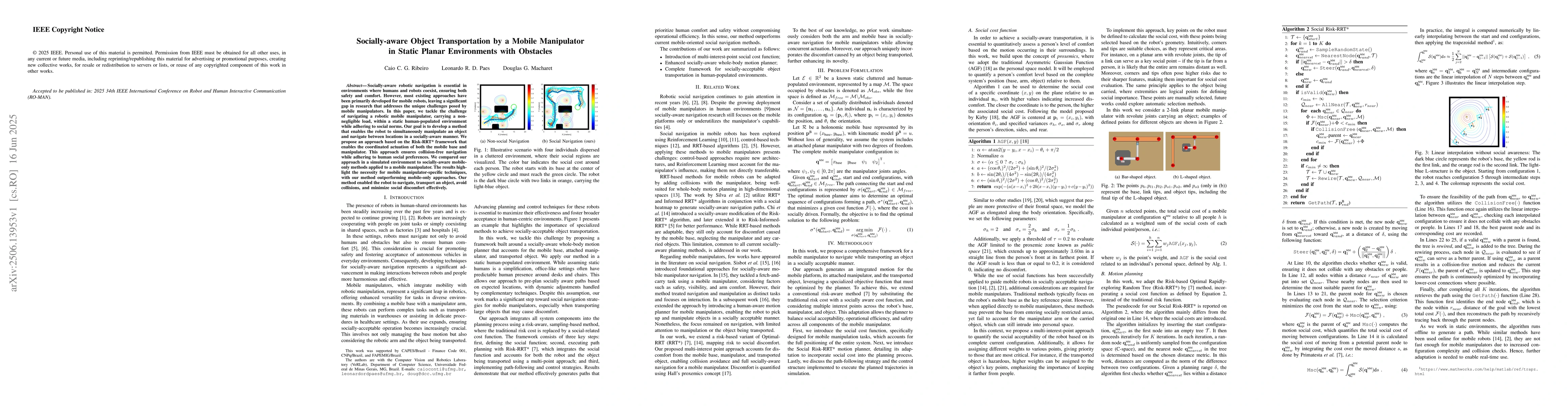 Socially-aware robotic navigation is essential in environments where humans and robots coexist, ensuring both safety and comfort. However, most existing approaches have been primarily developed for mobile robots, leaving a significant gap in research that addresses the unique challenges posed by mobile manipulators. In this paper, we tackle the challenge of navigating a robotic mobile manipulator, carrying a non-negligible load, within a static human-populated environment while adhering to social norms. Our goal is to develop a method that enables the robot to simultaneously manipulate an object and navigate between locations in a socially-aware manner. We propose an approach based on the Risk-RRT* framework that enables the coordinated actuation of both the mobile base and manipulator. This approach ensures collision-free navigation while adhering to human social preferences. We compared our approach in a simulated environment to socially-aware mobile-only methods applied to a mobile manipulator. The results highlight the necessity for mobile manipulator-specific techniques, with our method outperforming mobile-only approaches. Our method enabled the robot to navigate, transport an object, avoid collisions, and minimize social discomfort effectively.