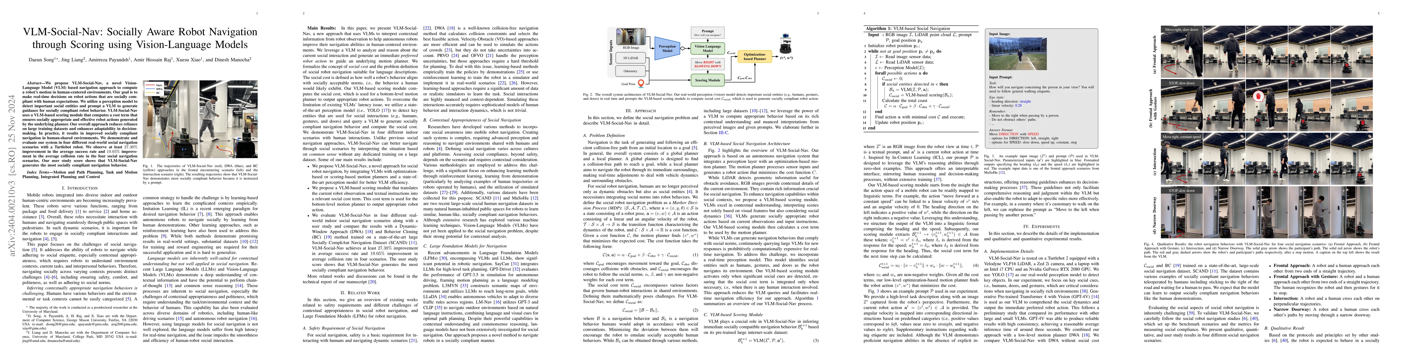 The paper introduces VLM-Social-Nav, a vision-language model-based navigation system that enables robots to make socially compliant real-time decisions in human-centered environments. The approach improves socially appropriate navigation and reduces reliance on extensive training data, demonstrating significant improvements in success and collision rates in real-world scenarios.