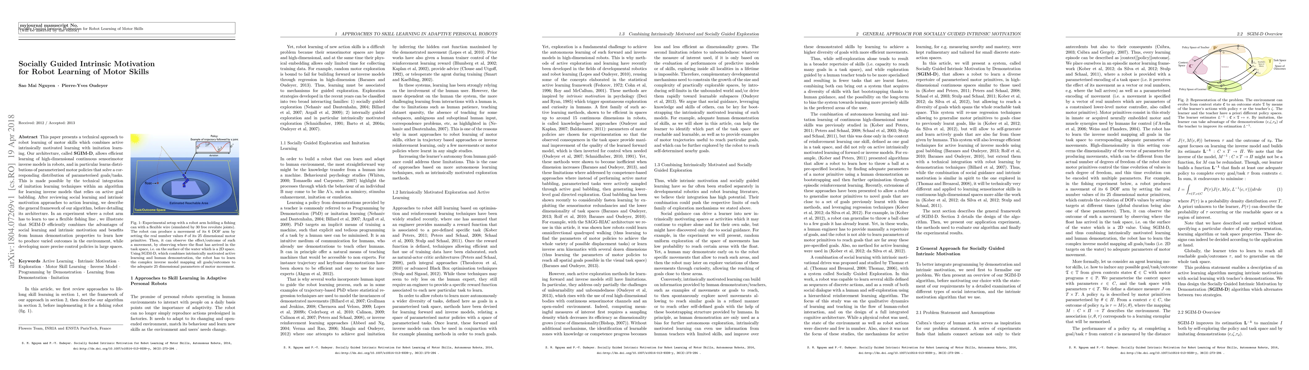 This paper introduces SGIM-D, a robot learning architecture that combines intrinsically motivated learning with imitation learning to efficiently acquire motor skills. The approach leverages human demonstrations to develop precise control policies, demonstrated through a robot arm learning to manipulate a fishing line.
