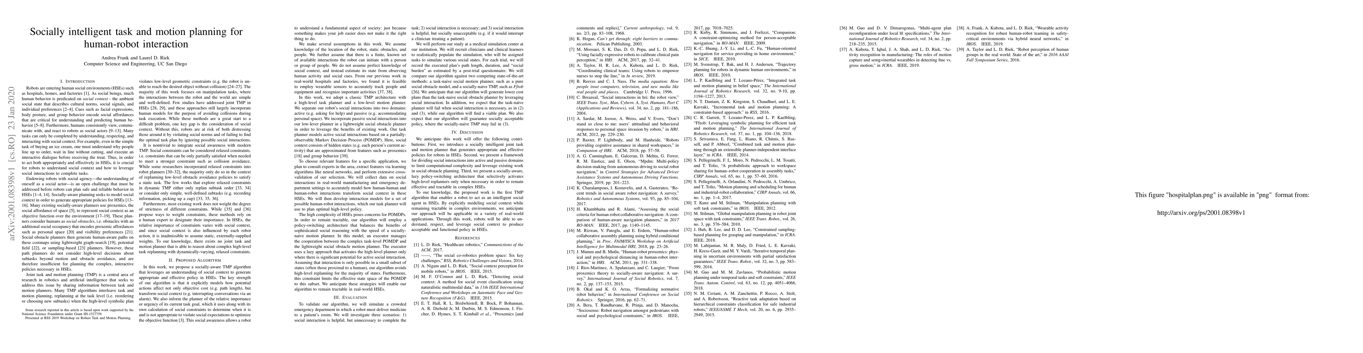 This paper proposes a socially-aware task and motion planning algorithm that considers social context to generate appropriate plans in human social environments. The algorithm models how actions affect both objective costs and social context, balancing task urgency with social expectations to ensure socially intelligent behavior.
