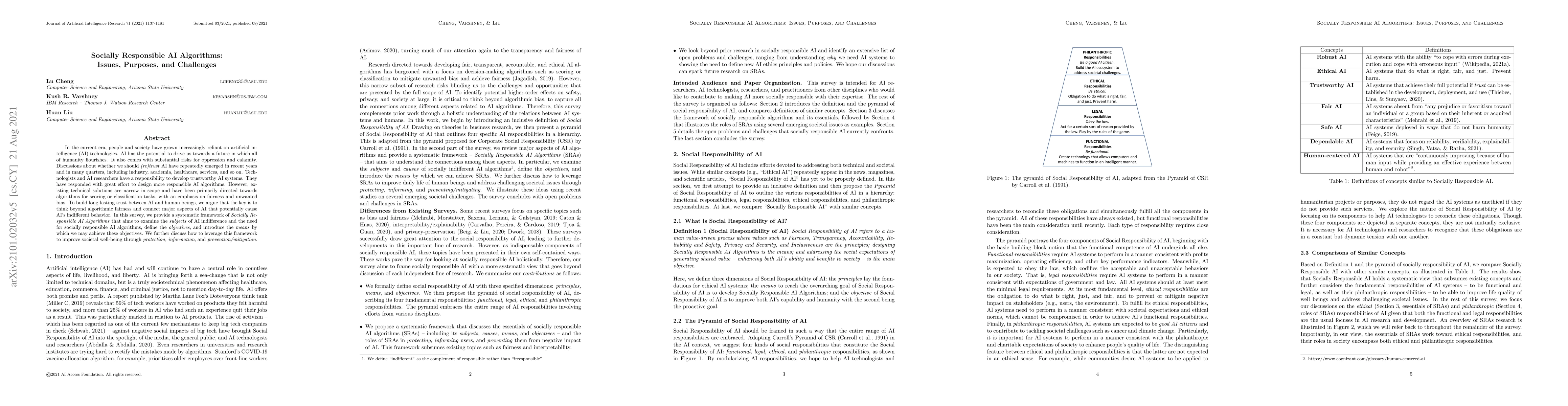 In the current era, people and society have grown increasingly reliant on artificial intelligence (AI) technologies. AI has the potential to drive us towards a future in which all of humanity flourishes. It also comes with substantial risks for oppression and calamity. Discussions about whether we should (re)trust AI have repeatedly emerged in recent years and in many quarters, including industry, academia, healthcare, services, and so on. Technologists and AI researchers have a responsibility to develop trustworthy AI systems. They have responded with great effort to design more responsible AI algorithms. However, existing technical solutions are narrow in scope and have been primarily directed towards algorithms for scoring or classification tasks, with an emphasis on fairness and unwanted bias. To build long-lasting trust between AI and human beings, we argue that the key is to think beyond algorithmic fairness and connect major aspects of AI that potentially cause AI's indifferent behavior. In this survey, we provide a systematic framework of Socially Responsible AI Algorithms that aims to examine the subjects of AI indifference and the need for socially responsible AI algorithms, define the objectives, and introduce the means by which we may achieve these objectives. We further discuss how to leverage this framework to improve societal well-being through protection, information, and prevention/mitigation.