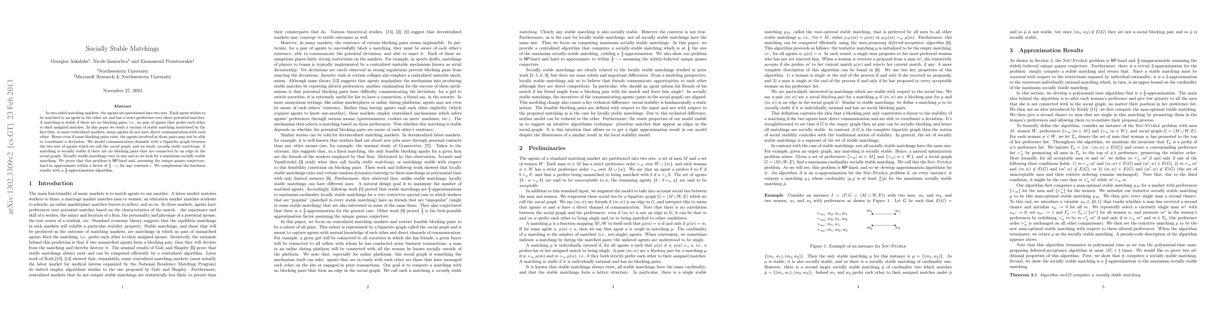This paper explores socially stable matchings in two-sided markets, where stability is defined by the absence of blocking pairs connected by edges in a social graph. It proves that finding the maximum socially stable matching is NP-hard and hard to approximate, complemented by a 3/2-approximation algorithm.