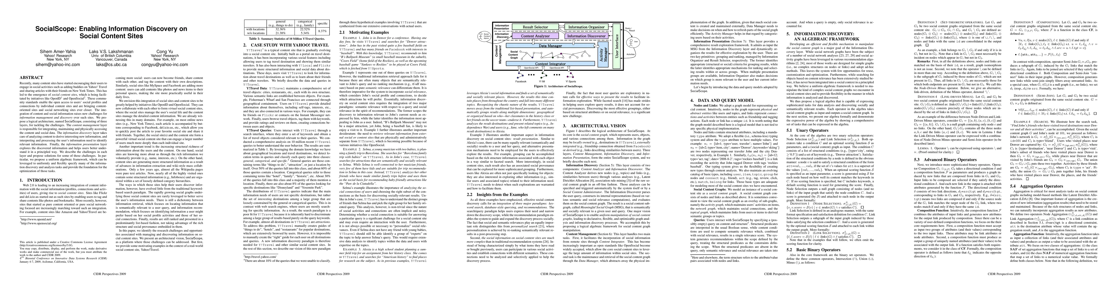 SocialScope is a proposed architecture to manage and discover information on social content sites, integrating content and social data through three layers: content management, information discovery, and information presentation. The framework addresses challenges in each layer with a uniform algebraic approach for flexible information discovery and analysis.