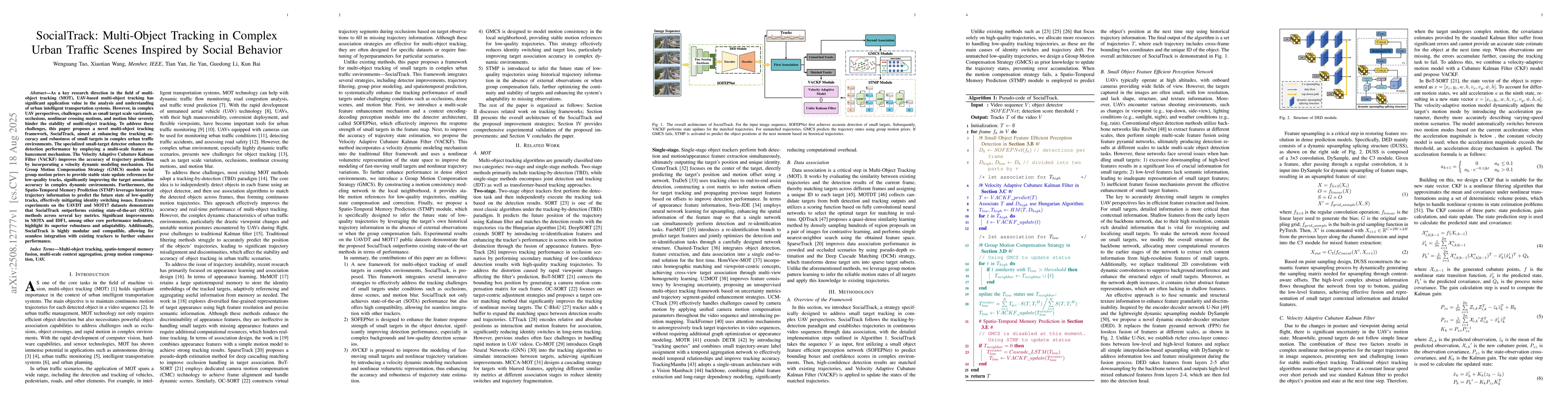 As a key research direction in the field of multi-object tracking (MOT), UAV-based multi-object tracking has significant application value in the analysis and understanding of urban intelligent transportation systems. However, in complex UAV perspectives, challenges such as small target scale variations, occlusions, nonlinear crossing motions, and motion blur severely hinder the stability of multi-object tracking. To address these challenges, this paper proposes a novel multi-object tracking framework, SocialTrack, aimed at enhancing the tracking accuracy and robustness of small targets in complex urban traffic environments. The specialized small-target detector enhances the detection performance by employing a multi-scale feature enhancement mechanism. The Velocity Adaptive Cubature Kalman Filter (VACKF) improves the accuracy of trajectory prediction by incorporating a velocity dynamic modeling mechanism. The Group Motion Compensation Strategy (GMCS) models social group motion priors to provide stable state update references for low-quality tracks, significantly improving the target association accuracy in complex dynamic environments. Furthermore, the Spatio-Temporal Memory Prediction (STMP) leverages historical trajectory information to predict the future state of low-quality tracks, effectively mitigating identity switching issues. Extensive experiments on the UAVDT and MOT17 datasets demonstrate that SocialTrack outperforms existing state-of-the-art (SOTA) methods across several key metrics. Significant improvements in MOTA and IDF1, among other core performance indicators, highlight its superior robustness and adaptability. Additionally, SocialTrack is highly modular and compatible, allowing for seamless integration with existing trackers to further enhance performance.