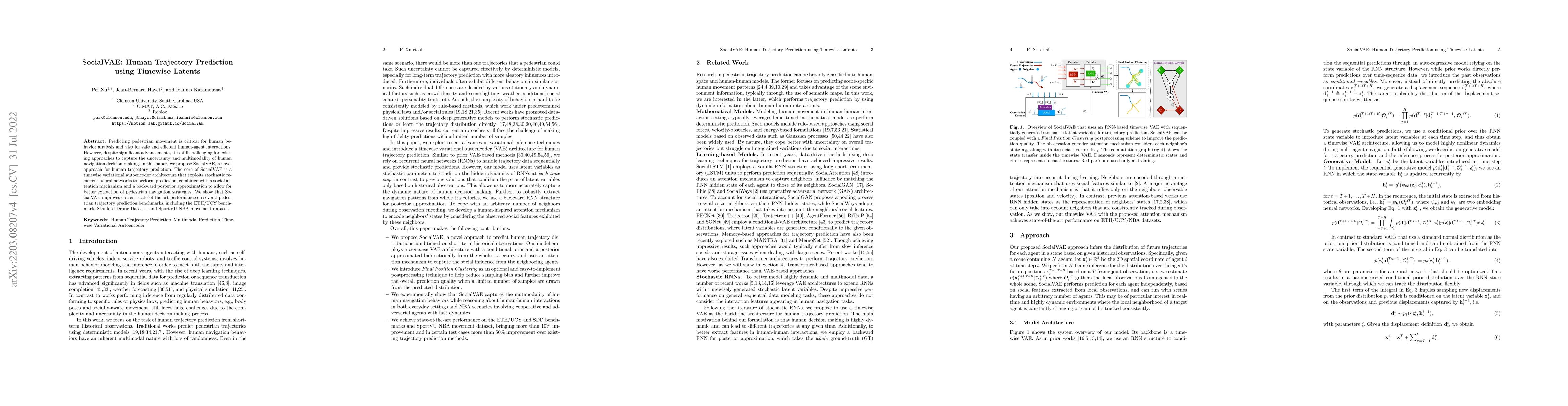 This paper introduces SocialVAE, a timewise variational autoencoder with a social attention mechanism for predicting pedestrian movement. It outperforms existing methods on multiple benchmarks by better capturing uncertainty and multimodality in human navigation.