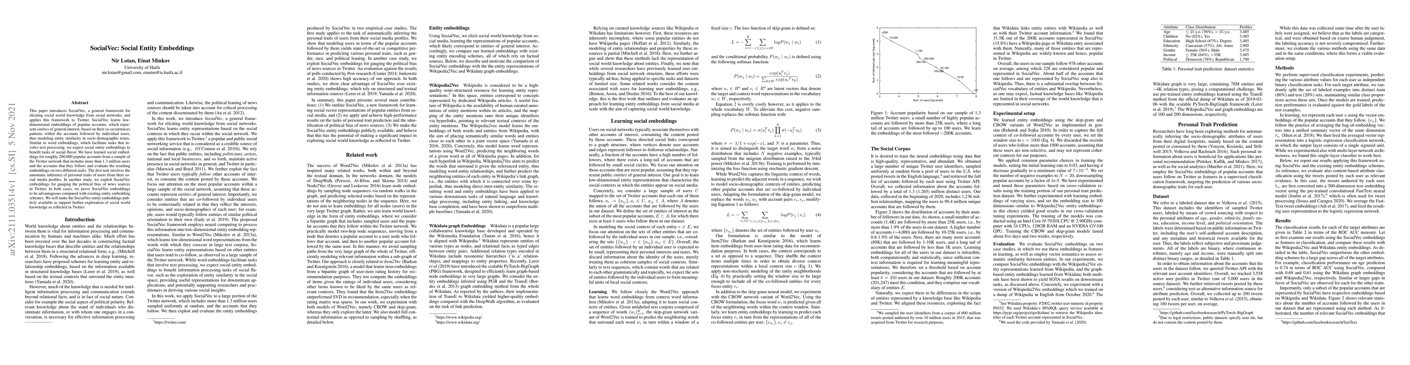 SocialVec is a framework for generating social entity embeddings from Twitter data, capturing the socio-demographic context of popular accounts. The embeddings are shown to outperform existing methods in inferring user traits and assessing news source bias.