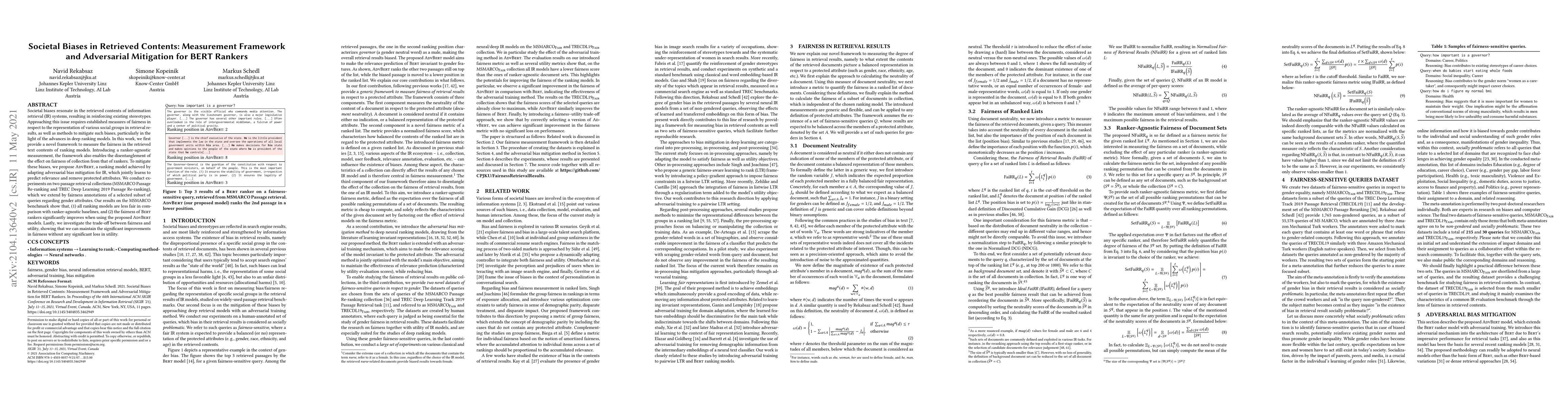 This paper introduces a novel framework to measure fairness in the retrieved contents of ranking models, specifically focusing on societal biases. It also proposes AdvBert, an adversarial mitigation method to improve the fairness of BERT rankers, demonstrating significant improvements in fairness without substantial loss in retrieval performance.