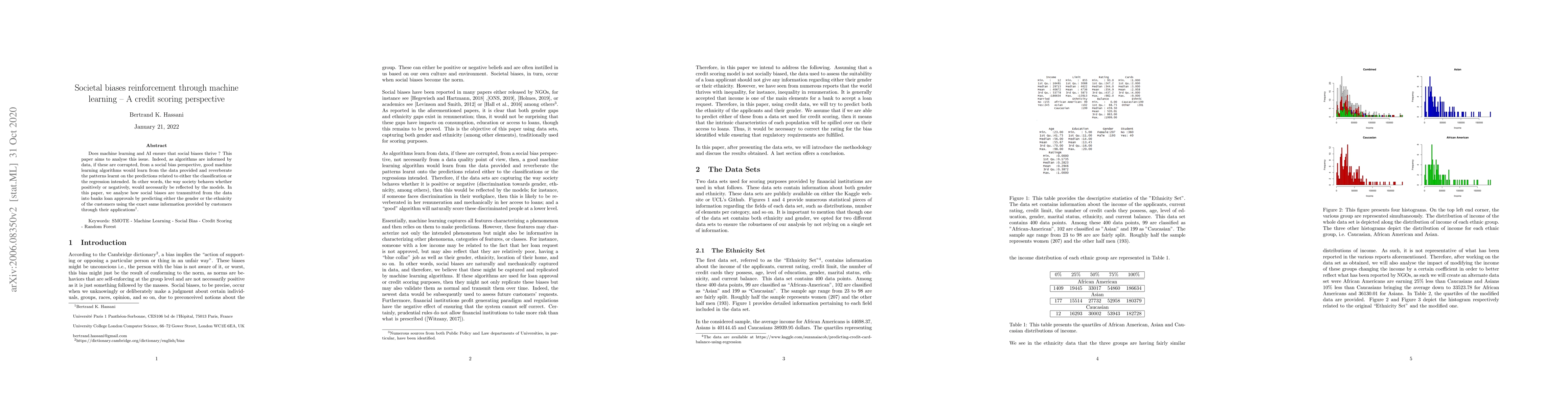 Does machine learning and AI ensure that social biases thrive ? This paper aims to analyse this issue. Indeed, as algorithms are informed by data, if these are corrupted, from a social bias perspective, good machine learning algorithms would learn from the data provided and reverberate the patterns learnt on the predictions related to either the classification or the regression intended. In other words, the way society behaves whether positively or negatively, would necessarily be reflected by the models. In this paper, we analyse how social biases are transmitted from the data into banks loan approvals by predicting either the gender or the ethnicity of the customers using the exact same information provided by customers through their applications.