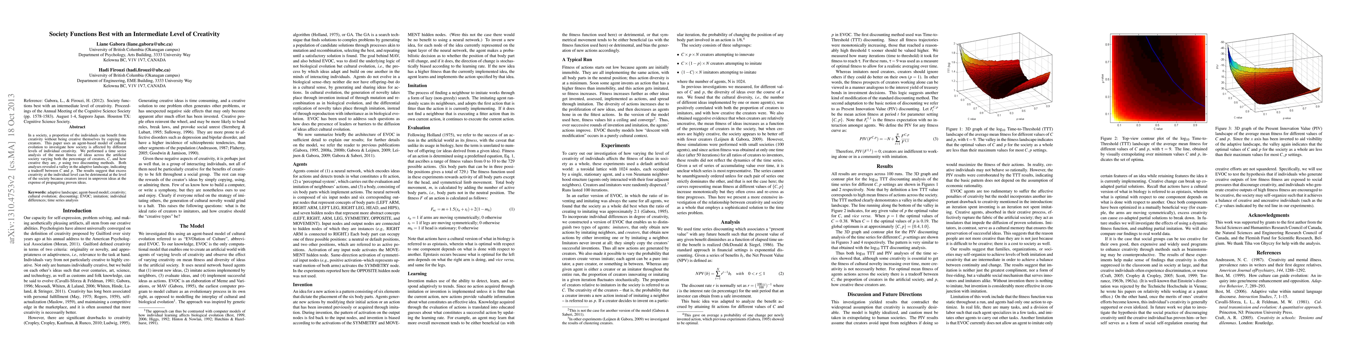 In a society, a proportion of the individuals can benefit from creativity without being creative themselves by copying the creators. This paper uses an agent-based model of cultural evolution to investigate how society is affected by different levels of individual creativity. We performed a time series analysis of the mean fitness of ideas across the artificial society varying both the percentage of creators, C, and how creative they are, p using two discounting methods. Both analyses revealed a valley in the adaptive landscape, indicating a tradeoff between C and p. The results suggest that excess creativity at the individual level can be detrimental at the level of the society because creators invest in unproven ideas at the expense of propagating proven ideas.