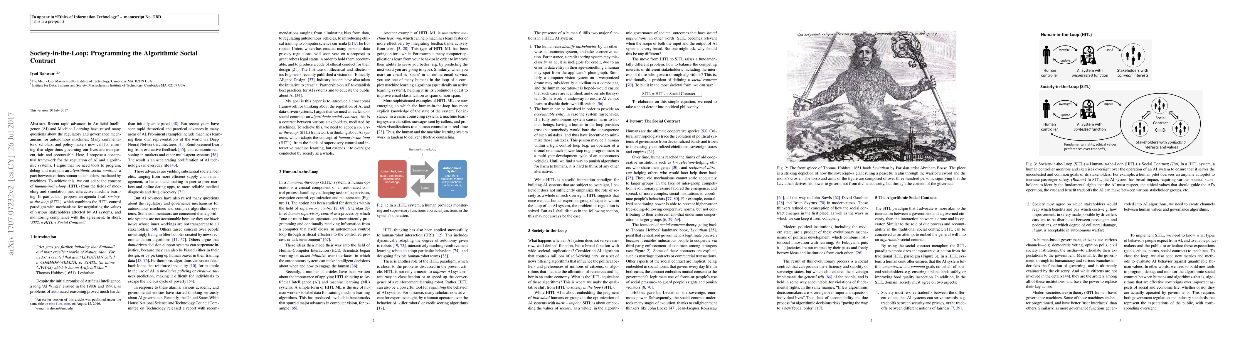 Recent rapid advances in Artificial Intelligence (AI) and Machine Learning have raised many questions about the regulatory and governance mechanisms for autonomous machines. Many commentators, scholars, and policy-makers now call for ensuring that algorithms governing our lives are transparent, fair, and accountable. Here, I propose a conceptual framework for the regulation of AI and algorithmic systems. I argue that we need tools to program, debug and maintain an algorithmic social contract, a pact between various human stakeholders, mediated by machines. To achieve this, we can adapt the concept of human-in-the-loop (HITL) from the fields of modeling and simulation, and interactive machine learning. In particular, I propose an agenda I call society-in-the-loop (SITL), which combines the HITL control paradigm with mechanisms for negotiating the values of various stakeholders affected by AI systems, and monitoring compliance with the agreement. In short, `SITL = HITL + Social Contract.'