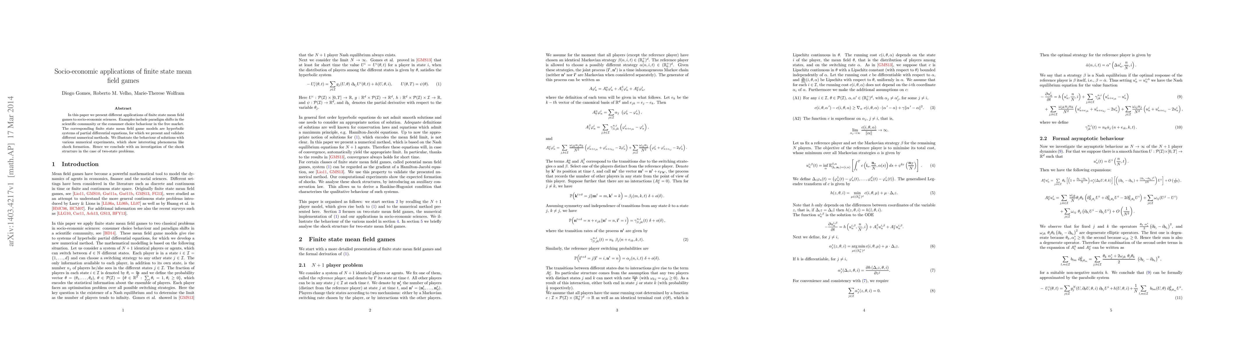 This paper explores socio-economic applications of finite state mean field games, modeling phenomena like scientific paradigm shifts and consumer choice behavior. It validates numerical methods for solving the corresponding hyperbolic PDE systems and demonstrates shock formation through numerical experiments.