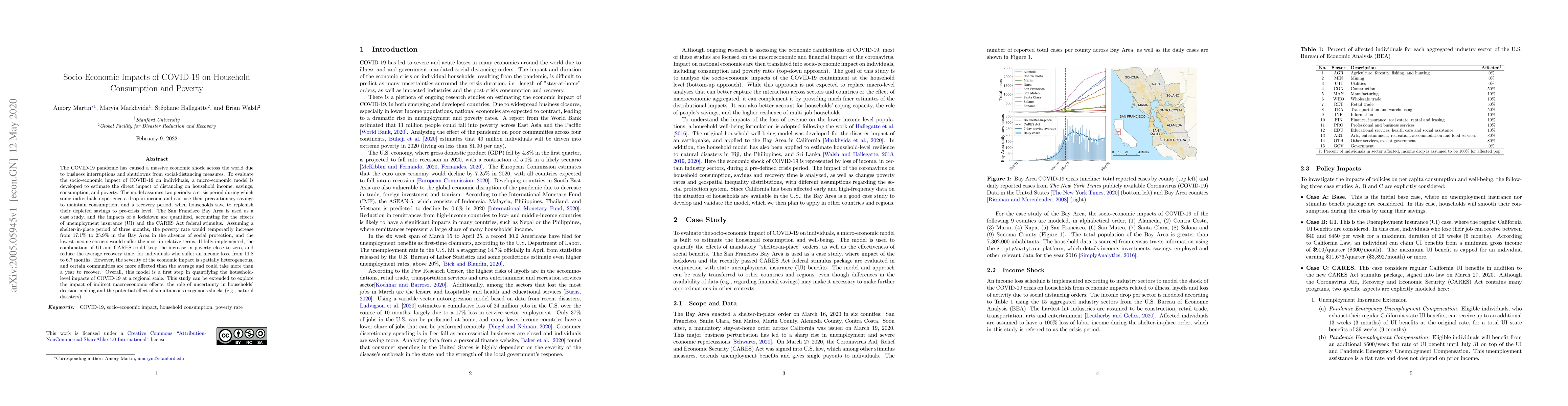 This study models the socio-economic impacts of COVID-19 on household consumption and poverty in the San Francisco Bay Area, revealing a temporary spike in poverty rates without social protection, which social safety nets like UI and CARES Act could mitigate. It highlights the regional disparities in recovery times, indicating some communities may take over a year to recover fully.