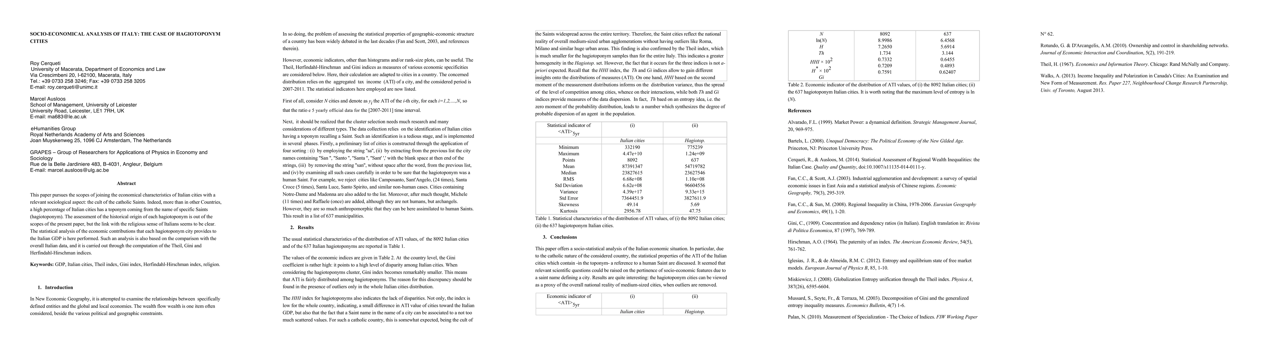 This paper pursues the scopes of joining the economical characteristics of Italian cities with a relevant sociological aspect: the cult of the catholic Saints. Indeed, more than in other Countries, a high percentage of Italian cities has a toponym coming from the name of specific Saints (hagiotoponym). The assessment of the historical origin of each hagiotoponym is out of the scopes of the present paper, but the link with the religious sense of Italians seems to be clear. The statistical analysis of the economic contributions that each hagiotoponym city provides to the Italian GDP is here performed. Such an analysis is also based on the comparison with the overall Italian data, and it is carried out through the computation of the Theil, Gini and Herfindahl-Hirschman indices.