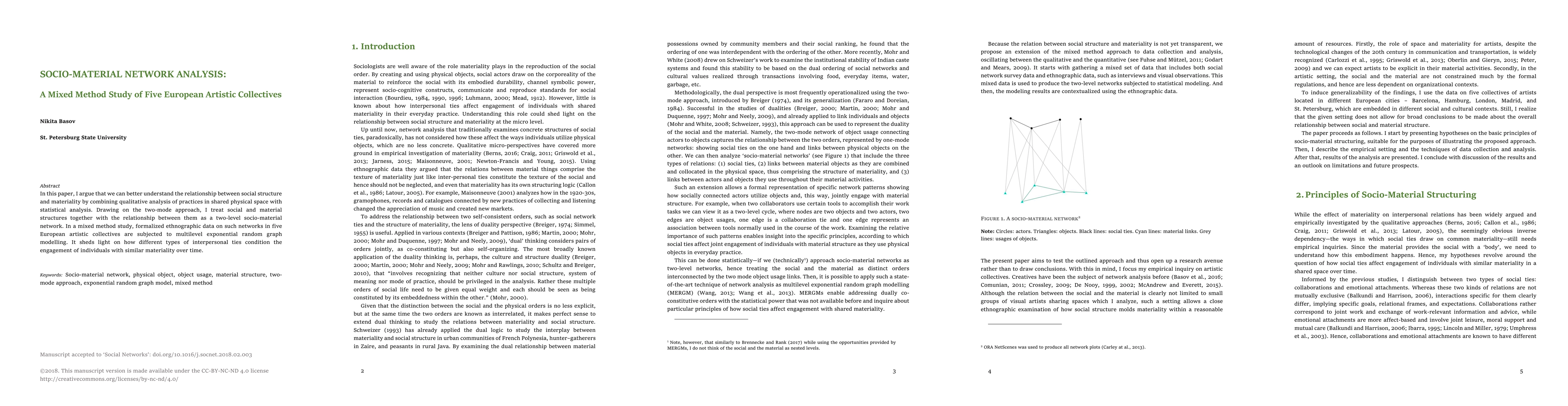 This study combines qualitative ethnographic data with statistical modelling to explore the socio-material network of five European artistic collectives, revealing how interpersonal ties influence individual engagement with shared material practices over time.