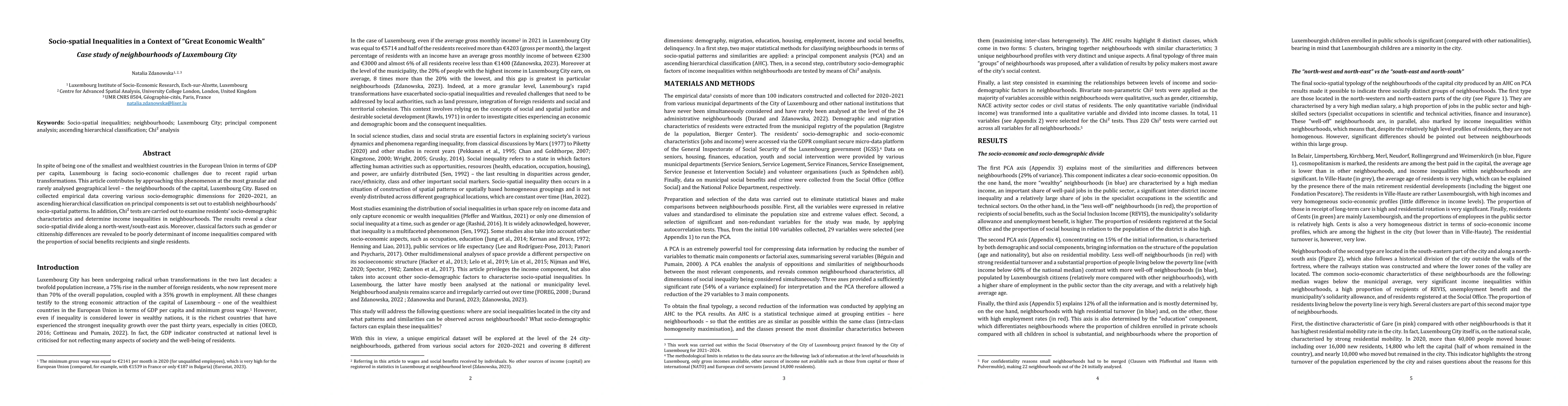 This study examines socio-spatial inequalities in Luxembourg City's neighbourhoods despite the country's high GDP per capita, revealing a north-west to south-east divide. Analysis shows income inequalities are more influenced by social benefits and single-resident status than gender or citizenship.