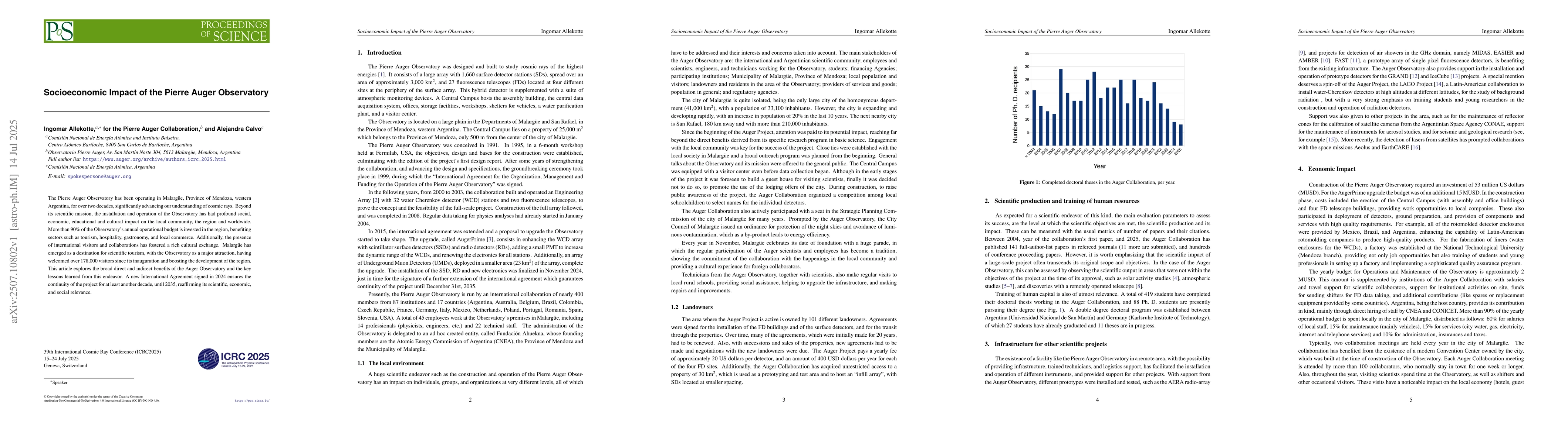 The Pierre Auger Observatory has been operating in Malargue, Province of Mendoza, western Argentina, for over two decades, significantly advancing our understanding of cosmic rays. Beyond its scientific mission, the installation and operation of the Observatory has had profound social, economic, educational and cultural impact on the local community, the region and worldwide. More than 90 percent of the Observatory's annual operational budget is invested in the region, benefiting sectors such as tourism, hospitality, gastronomy, and local commerce. Additionally, the presence of international visitors and collaborations has fostered a rich cultural exchange. Malargue has emerged as a destination for scientific tourism, with the Observatory as a major attraction, having welcomed over 178,000 visitors since its inauguration and boosting the development of the region. This article explores the broad direct and indirect benefits of the Auger Observatory and the key lessons learned from this endeavor. A new International Agreement signed in 2024 ensures the continuity of the project for at least another decade, until 2035, reaffirming its scientific, economic, and social relevance.