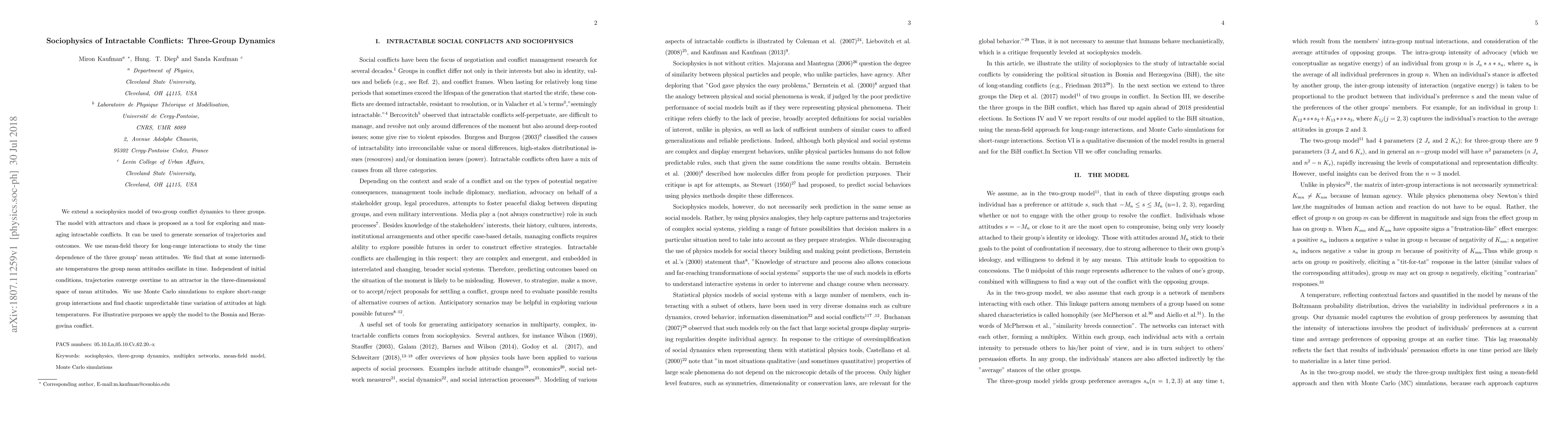We extend a sociophysics model of two-group conflict dynamics to three groups. The model with attractors and chaos is proposed as a tool for exploring and managing intractable conflicts. It can be used to generate scenarios of trajectories and outcomes. We use mean-field theory for long-range interactions to study the time dependence of the three grousp' mean attitudes. We find that at some intermediate temperatures the group mean attitudes oscillate in time. Independent of initial conditions, trajectories converge overtime to an attractor in the three-dimensional space of mean attitudes. We use Monte Carlo simulations to explore short-range group interactions and find chaotic unpredictable time variation of attitudes at high temperatures. For illustrative purposes we apply the model to the Bosnia and Herze-govina conflict.