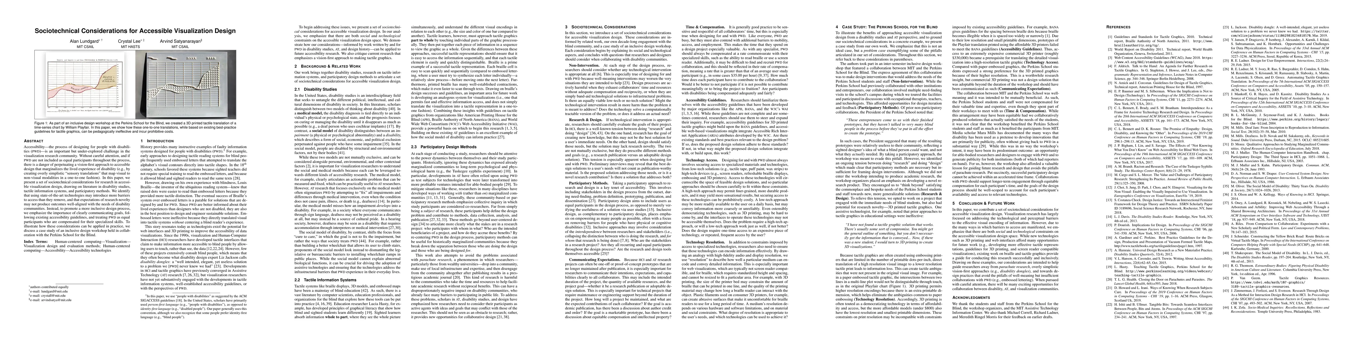 Accessibility--the process of designing for people with disabilities (PWD)--is an important but under-explored challenge in the visualization research community. Without careful attention, and if PWD are not included as equal participants throughout the process, there is a danger of perpetuating a vision-first approach to accessible design that marginalizes the lived experience of disability (e.g., by creating overly simplistic "sensory translations" that map visual to non-visual modalities in a one-to-one fashion). In this paper, we present a set of sociotechnical considerations for research in accessible visualization design, drawing on literature in disability studies, tactile information systems, and participatory methods. We identify that using state-of-the-art technologies may introduce more barriers to access than they remove, and that expectations of research novelty may not produce outcomes well-aligned with the needs of disability communities. Instead, to promote a more inclusive design process, we emphasize the importance of clearly communicating goals, following existing accessibility guidelines, and treating PWD as equal participants who are compensated for their specialized skills. To illustrate how these considerations can be applied in practice, we discuss a case study of an inclusive design workshop held in collaboration with the Perkins School for the Blind.