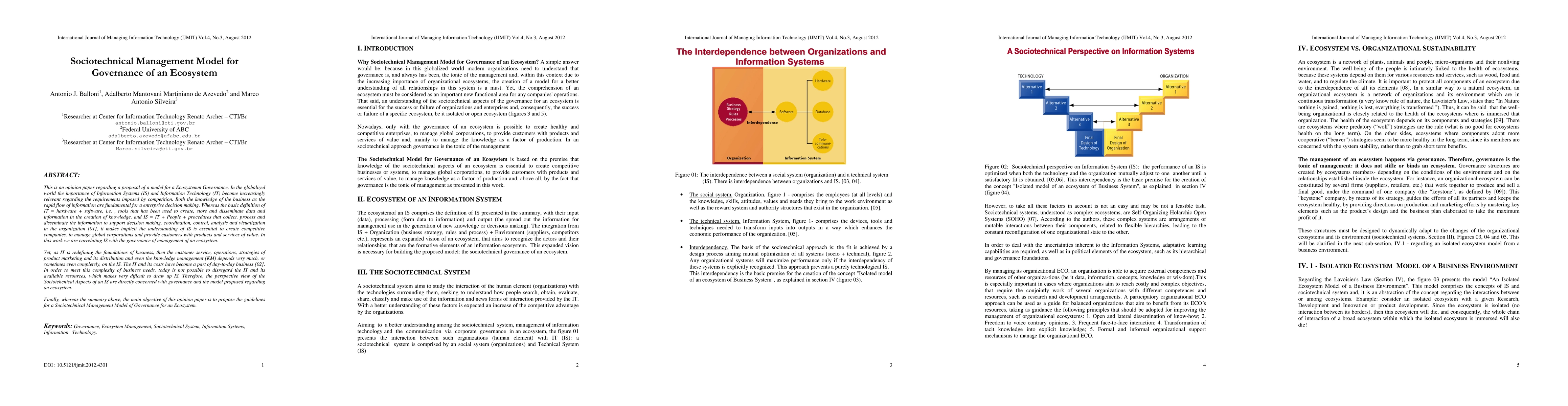 This is an opinion paper regarding a proposal of a model for a Ecosystemm Governance. In the globalized world the importance of Information Systems (IS) and Information Technology (IT) become increasingly relevant regarding the requirements imposed by competition. Both the knowledge of the business as the rapid flow of information are fundamental for a enterprise decision making. Whereas the basic definition of IT = hardware + software, i.e., tools that has been used to create, store and disseminate data and information in the creation of knowledge, and IS = IT + People + procedures that collect, process and disseminate the information to support decision making, coordination, control, analysis and visualization in the organization [01], it makes implicit the understanding of IS is essential to create competitive companies, to manage global corporations and provide customers with products and services of value. In this work we are correlating IS with the governance of management of an ecosystem. Yet, as IT is redefining the foundations of business, then the customer service, operations, strategies of product marketing and its distribution and even the knowledge management (KM) depends very much, or sometimes even completely, on the IS. The IT and its costs have become a part of day-to-day business [02]. In order to meet this complexity of business needs, today is not possible to disregard the IT and its available resources, which makes very dificult to draw up IS. Therefore, the perspective view of the Sociotehcnical Aspects of an IS are directly concerned with governance and the model proposed regarding an ecosystem. Finally, whereas the summary above, the main objective of this opinion paper is to propose the guidelines for a Sociotechnical Management Model of Governance for an Ecosystem.