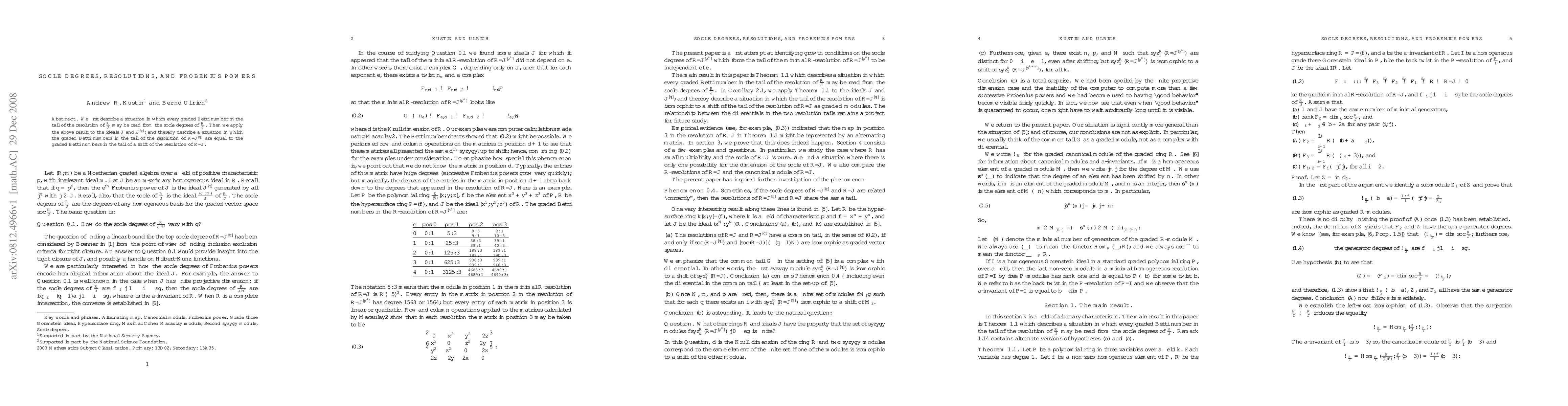 We first describe a situation in which every graded Betti number in the tail of the resolution of $\frac RJ$ may be read from the socle degrees of $\frac RJ$. Then we apply the above result to the ideals $J$ and $J^{[q]}$; and thereby describe a situation in which the graded Betti numbers in the tail of the resolution of $R/J^{[q]}$ are equal to the graded Betti numbers in the tail of a shift of the resolution of $R/J$.