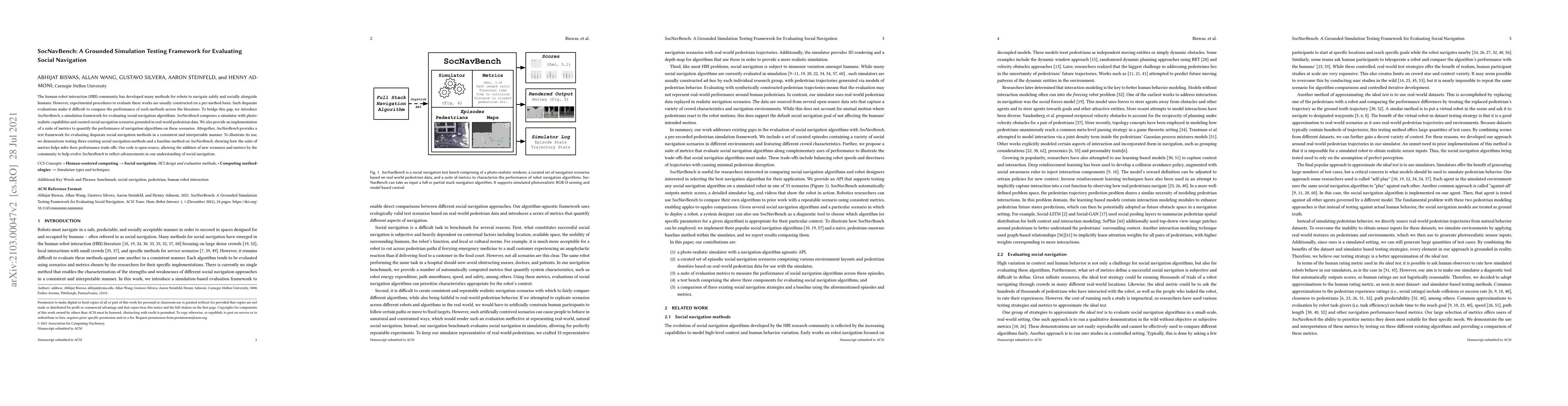 SocNavBench is a simulation framework designed to evaluate social navigation algorithms using photo-realistic simulations and real-world pedestrian data. It offers a consistent and interpretable method for comparing various social navigation techniques, with an open-source codebase to facilitate community contributions.