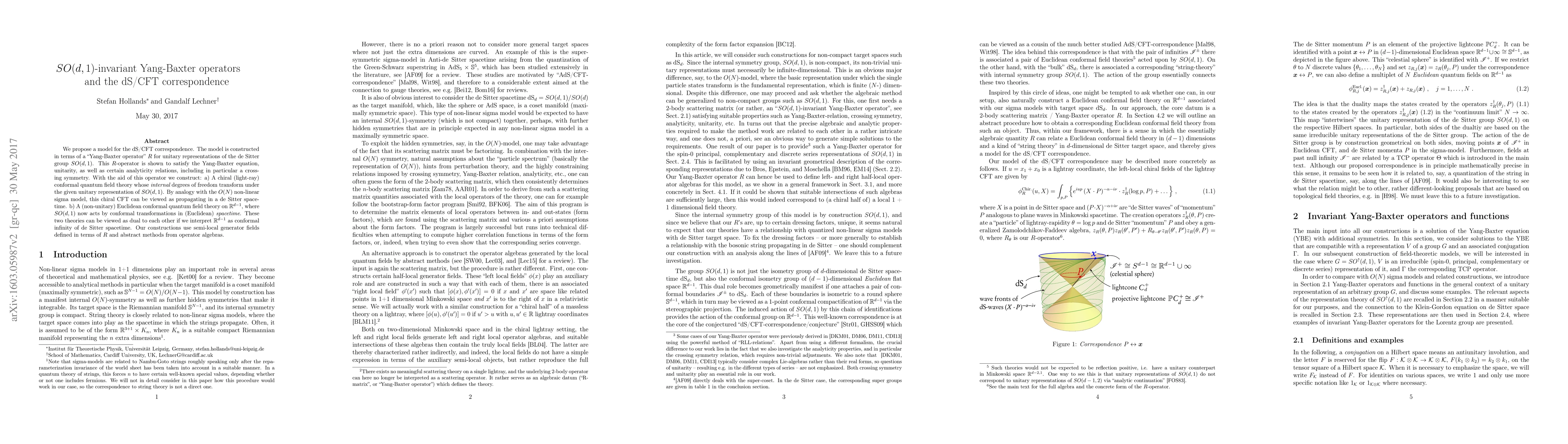 The paper proposes a model for the dS/CFT correspondence using a SO(d,1)-invariant Yang-Baxter operator, constructing two dual conformal field theories: a chiral CFT in deSitter spacetime and a Euclidean CFT on ${\mathbb R}^{d-1}$, leveraging semi-local generator fields and operator algebra techniques.